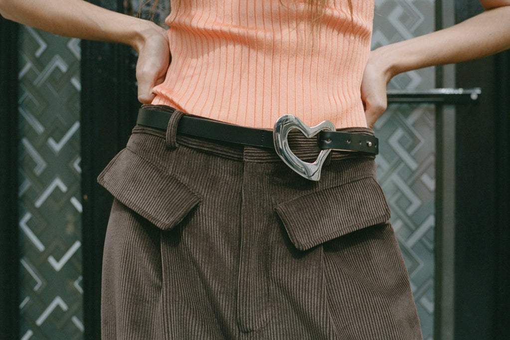 A slim leather belt with a polished heart-shaped buckle. Adjustable peg and loop fastening.