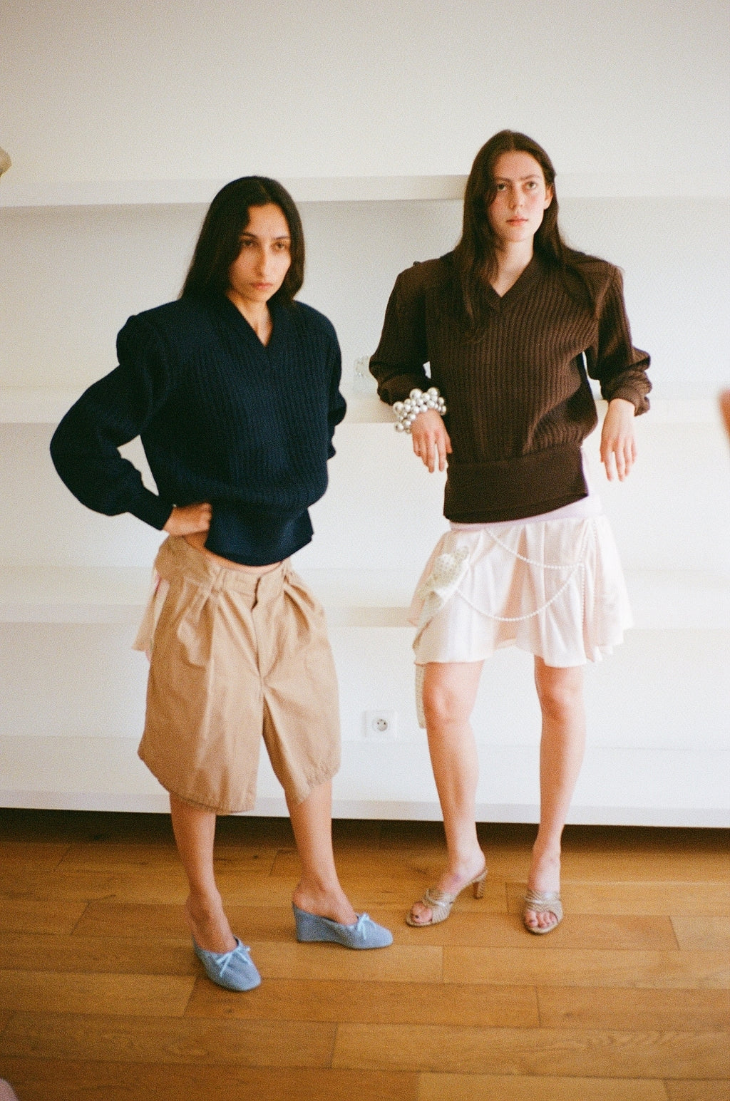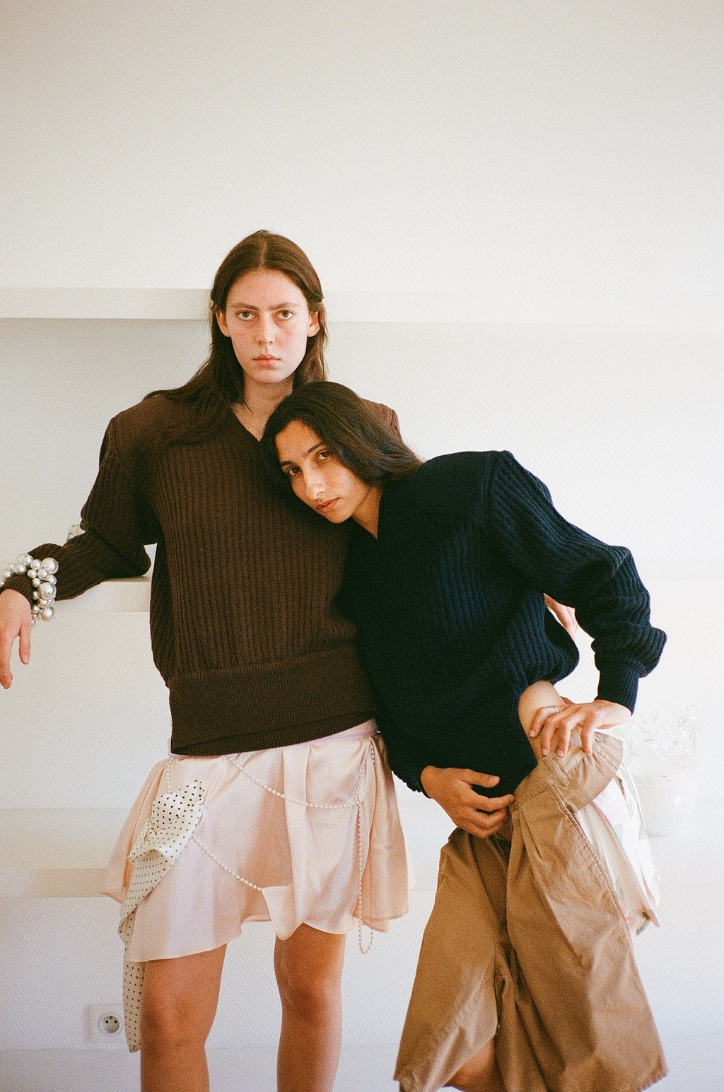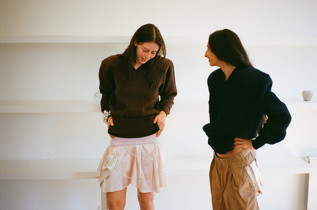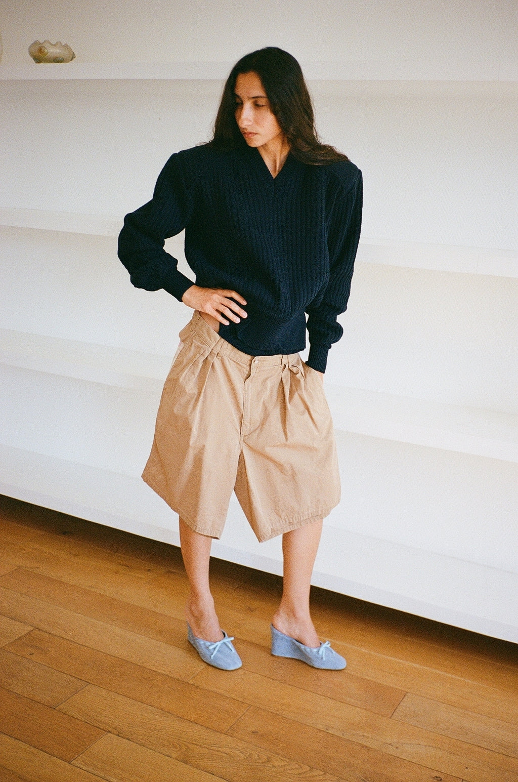 A cashmere and merino blend army style sweater, with detachable shoulder pads, and a cropped waist with an elastic in the back.