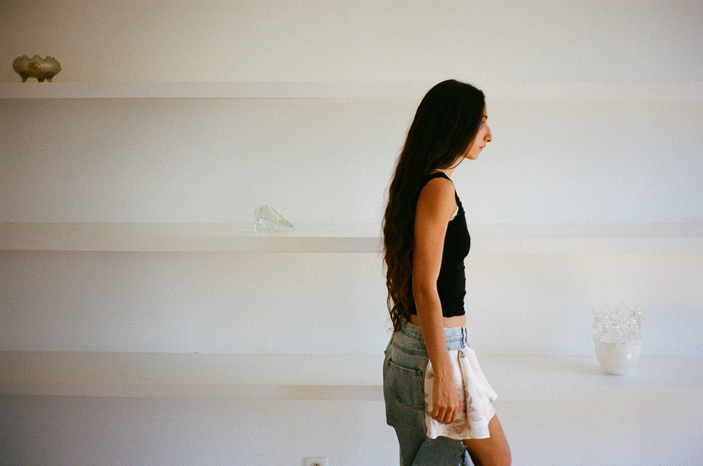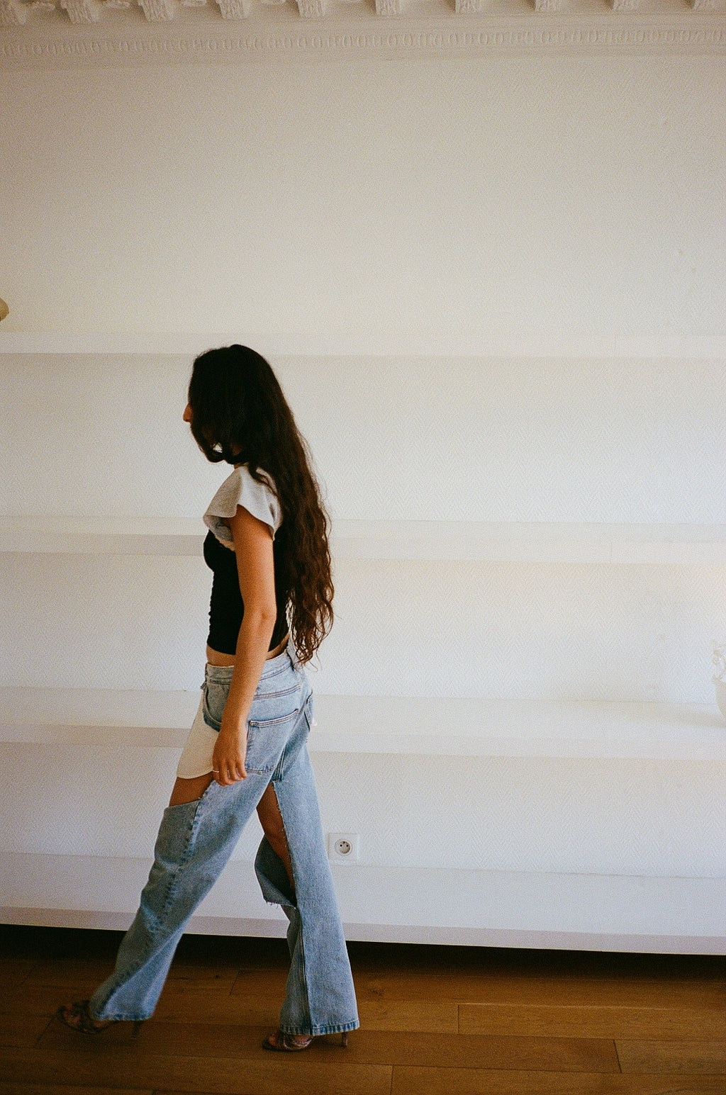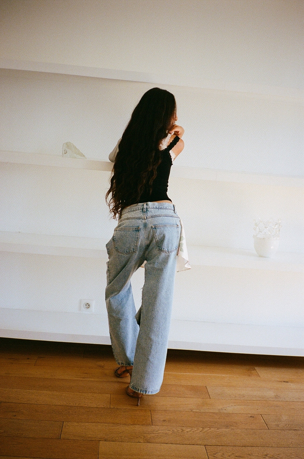 Cut-out jeans with a floral print skirt, loose fitting and relaxed.