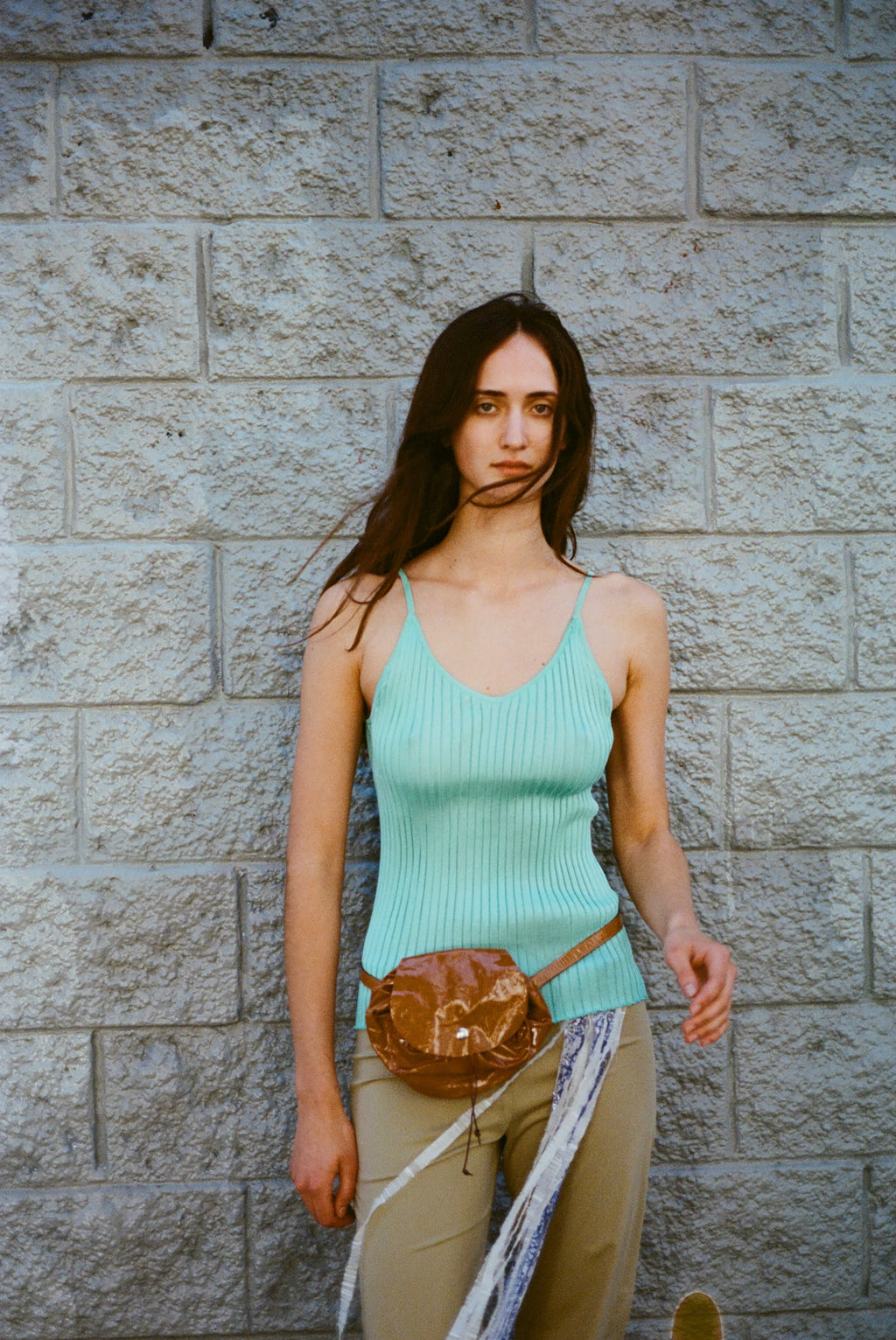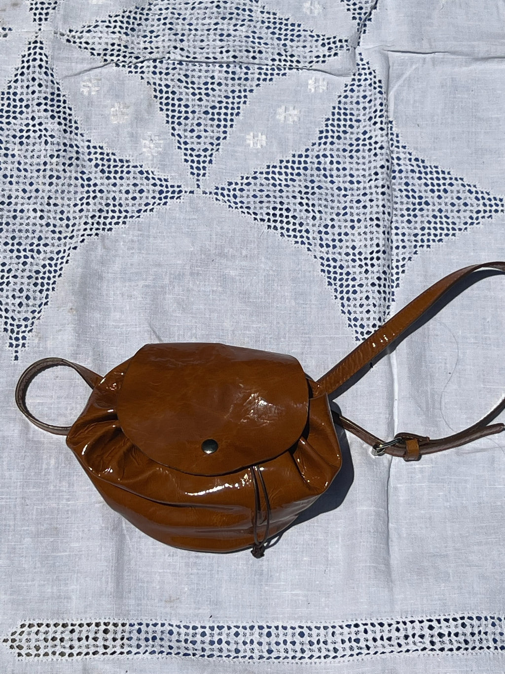 Leather pouch with snap closure. Attached to leather belt with silver hardware. Adjustable.