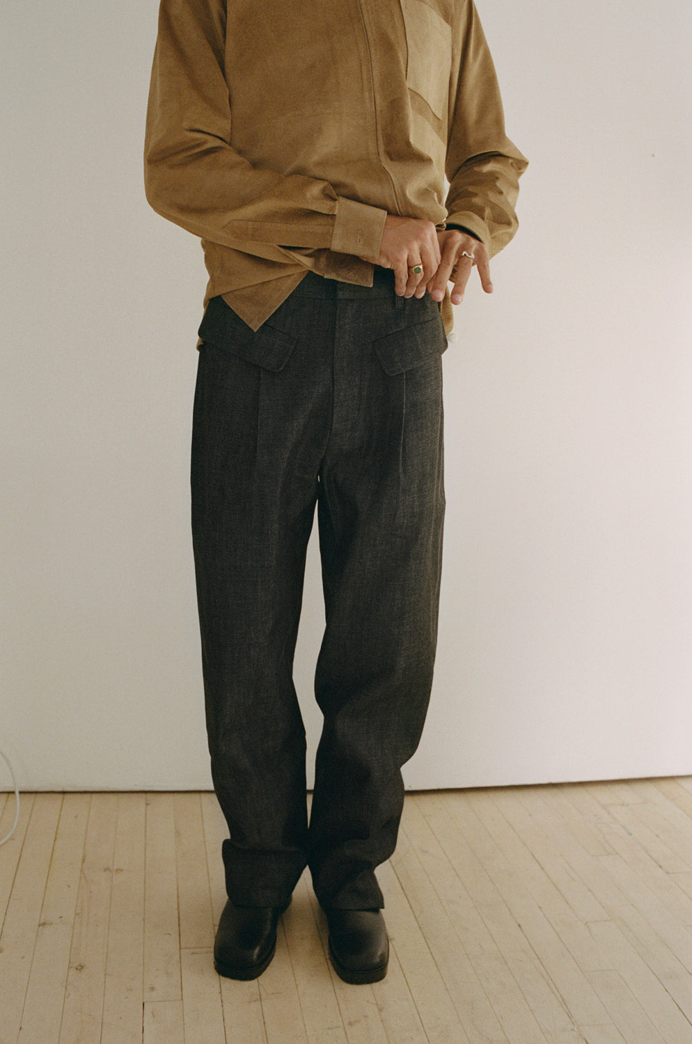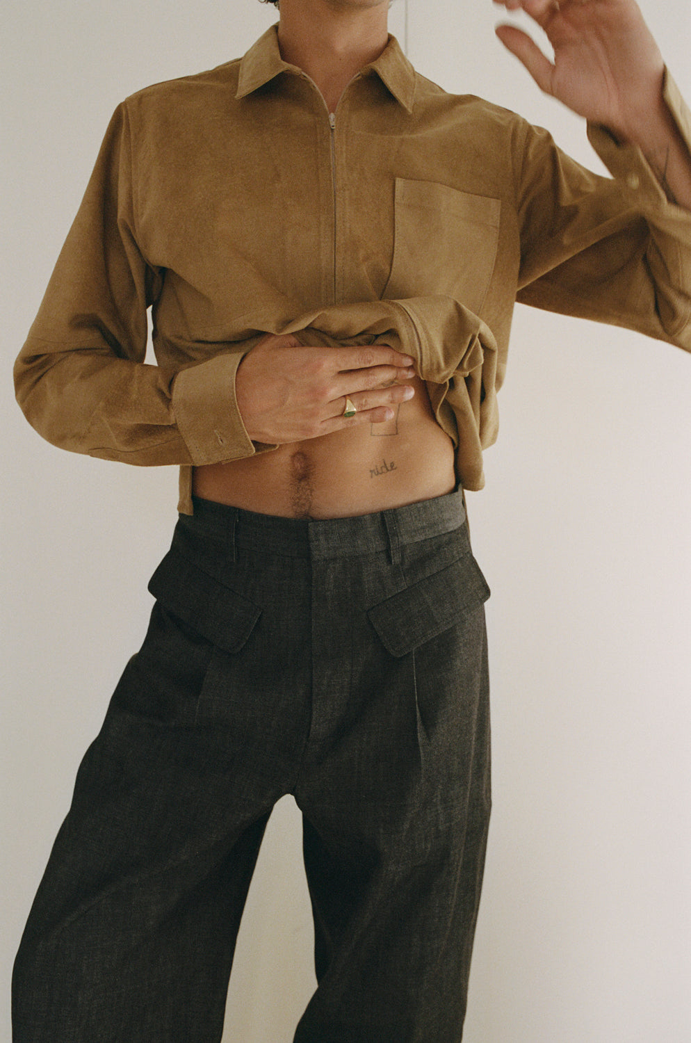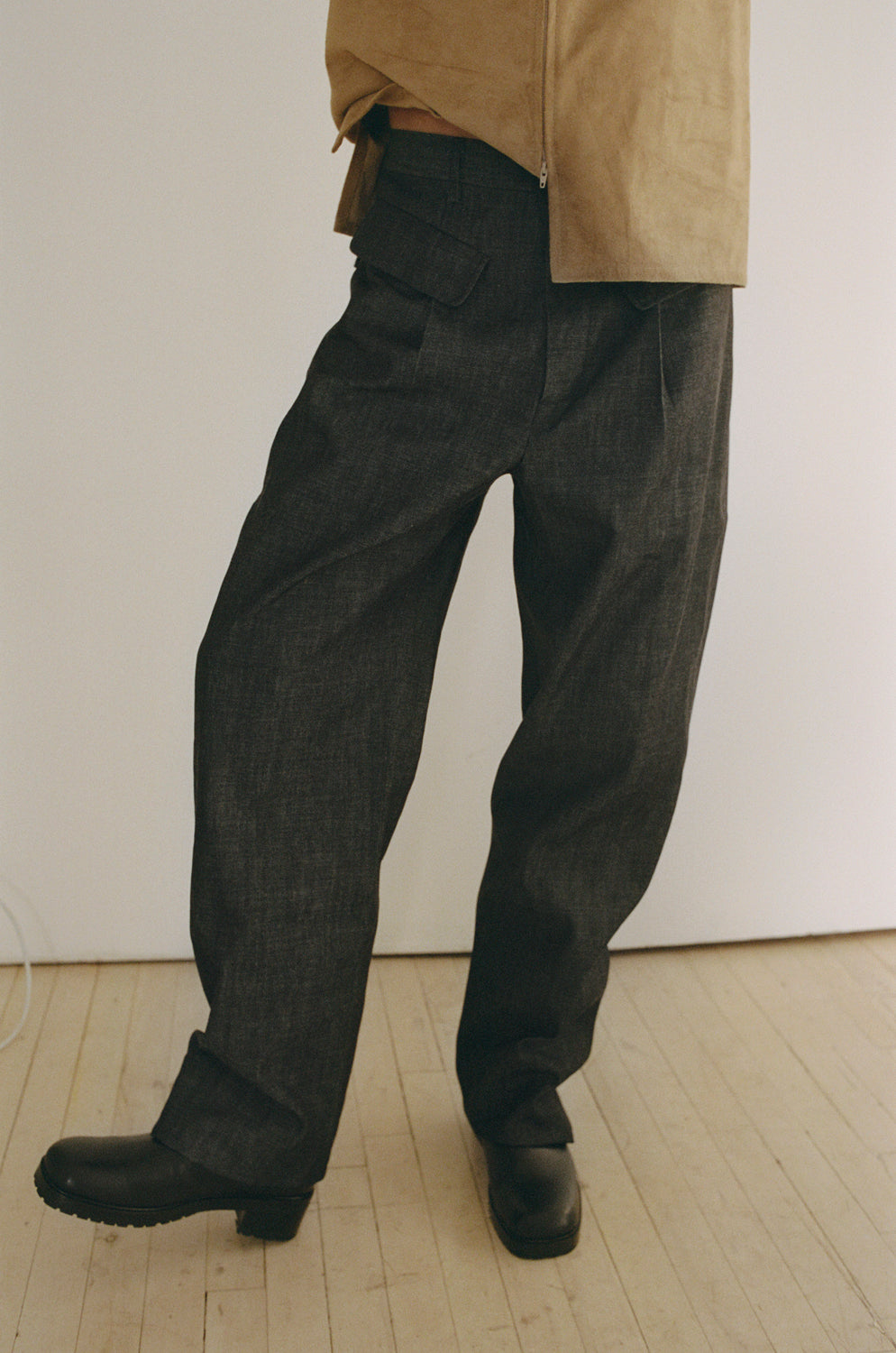 Mid rise wide leg trouser with exposed front pockets.