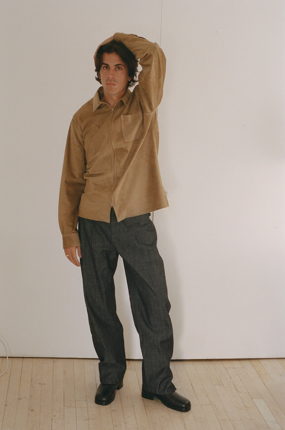 Features a zip-front closure with button fastening. Unisex style.