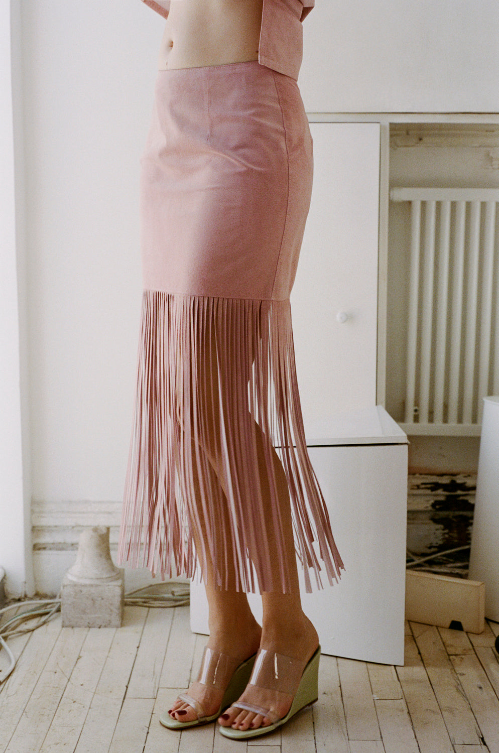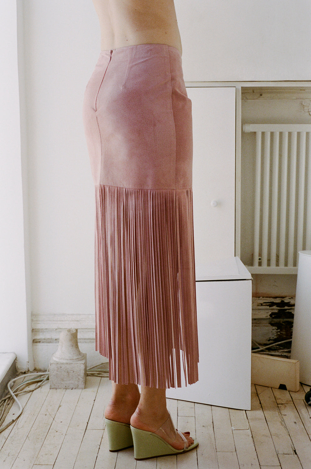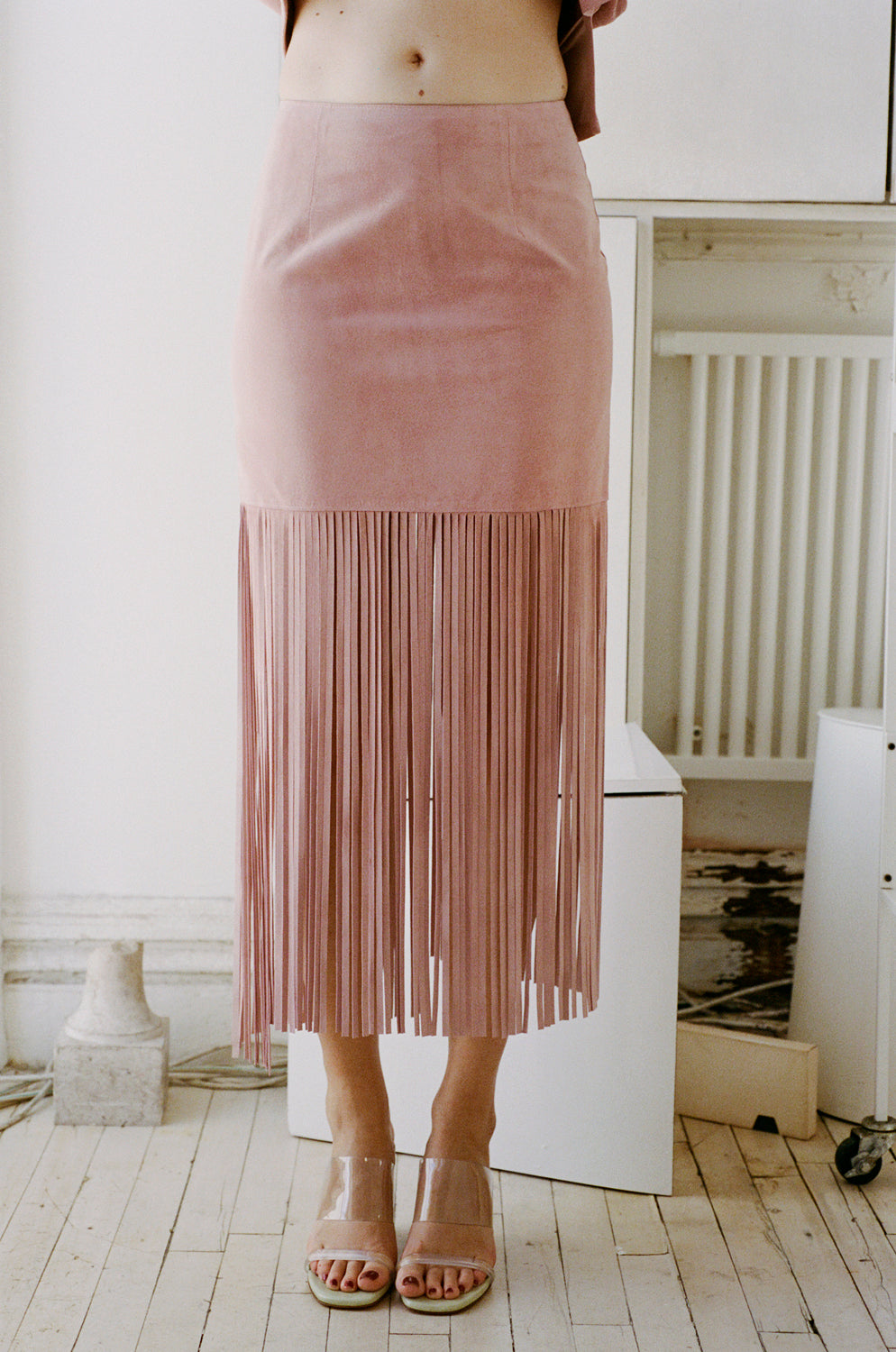 A midi-length, mid rise skirt featuring fringe that begins above the knee.
