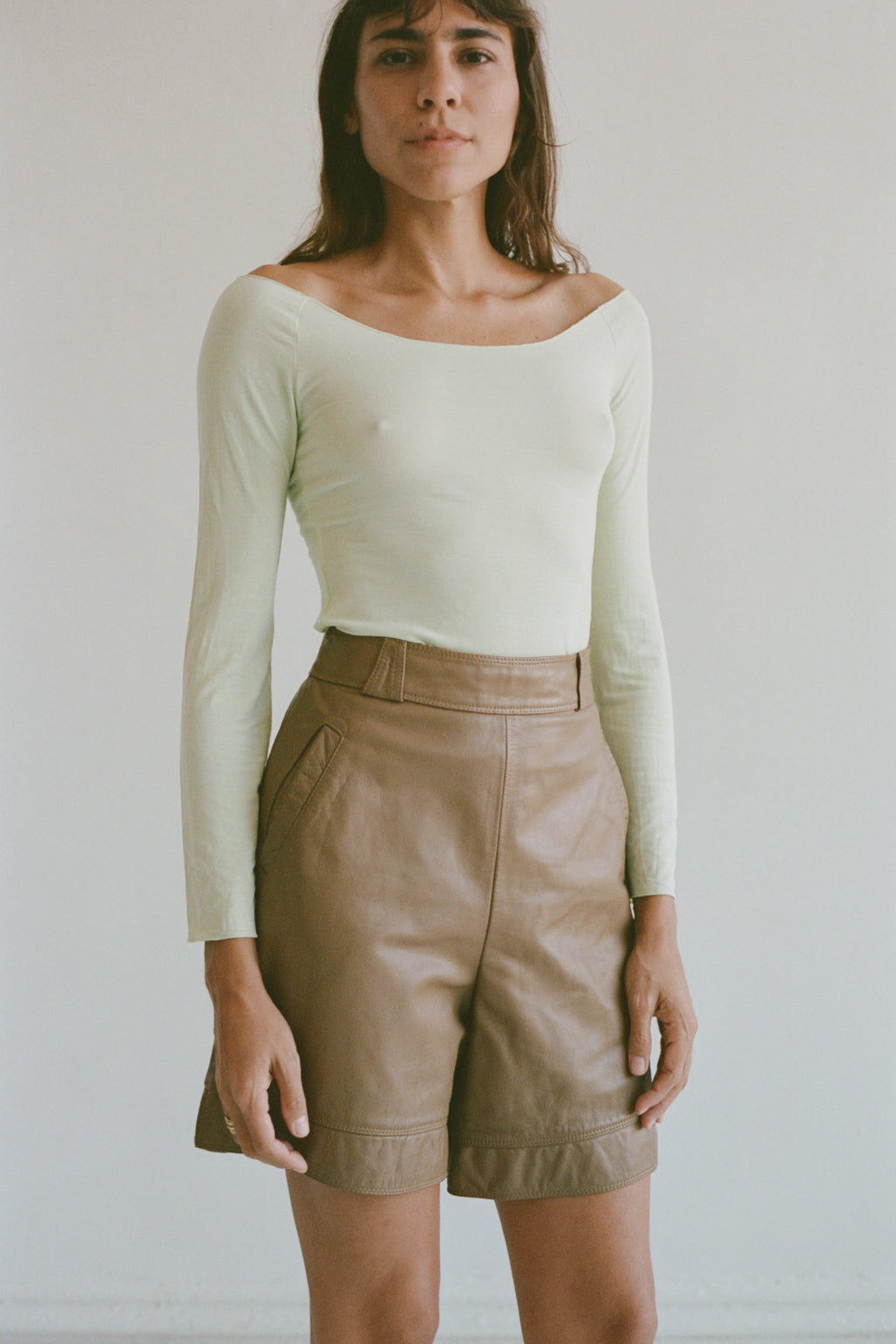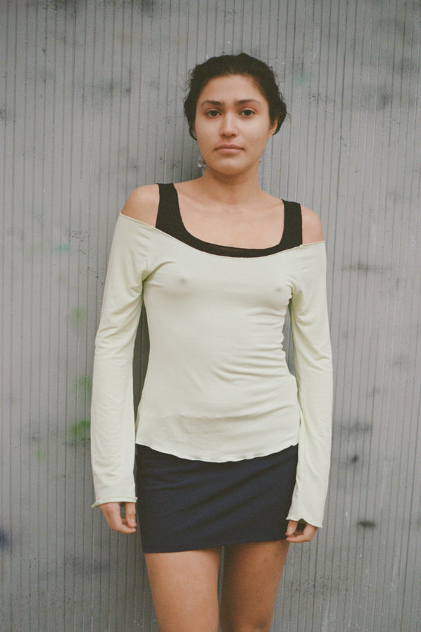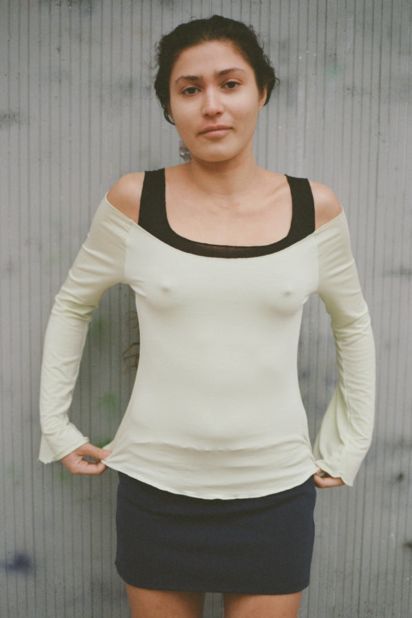 A long sleeve, off-the shoulder shirt with flared sleeves and fitted body. Super soft material.