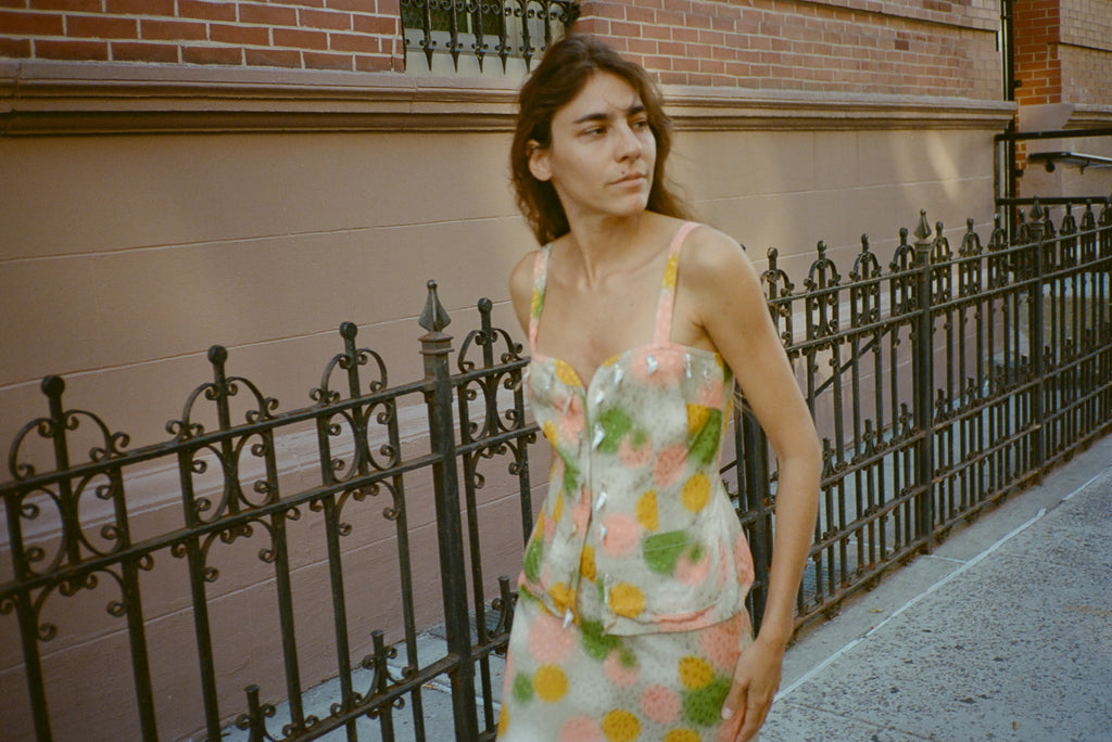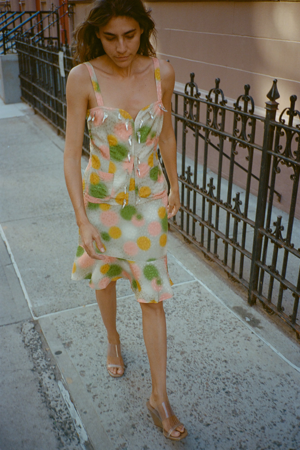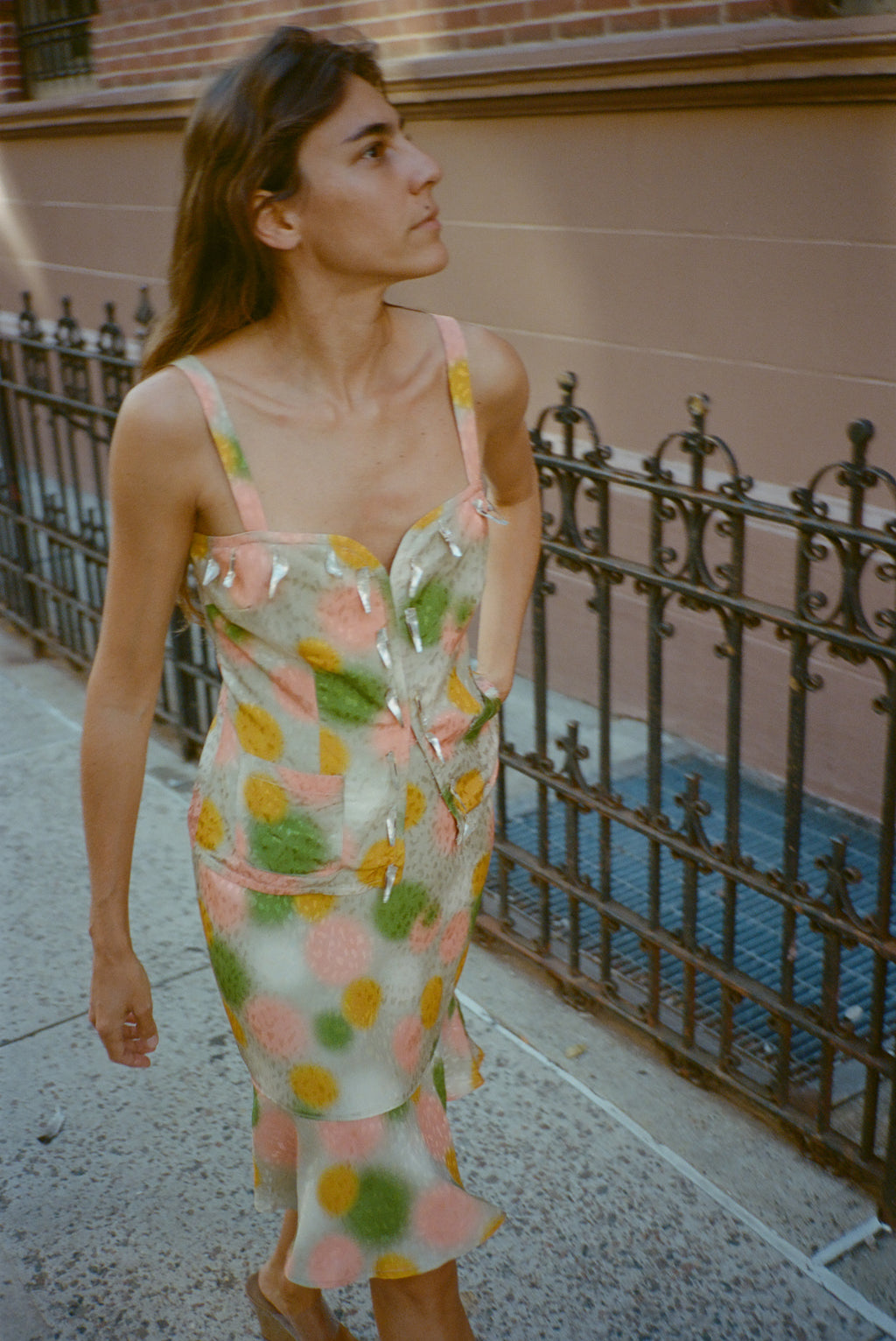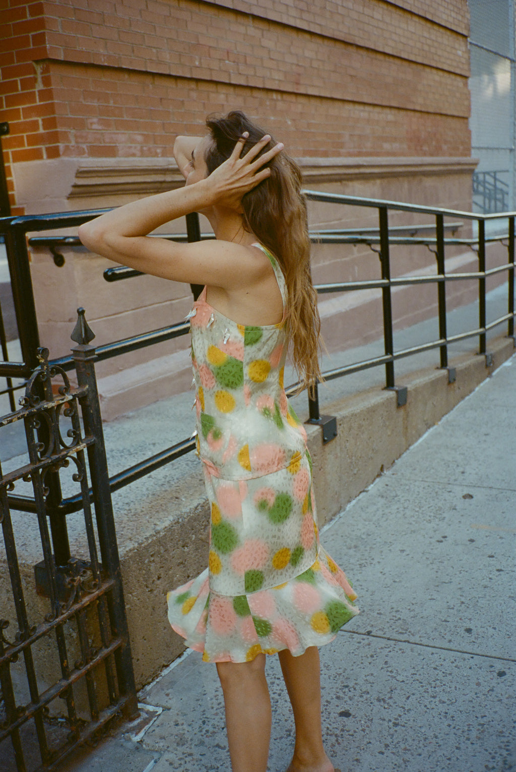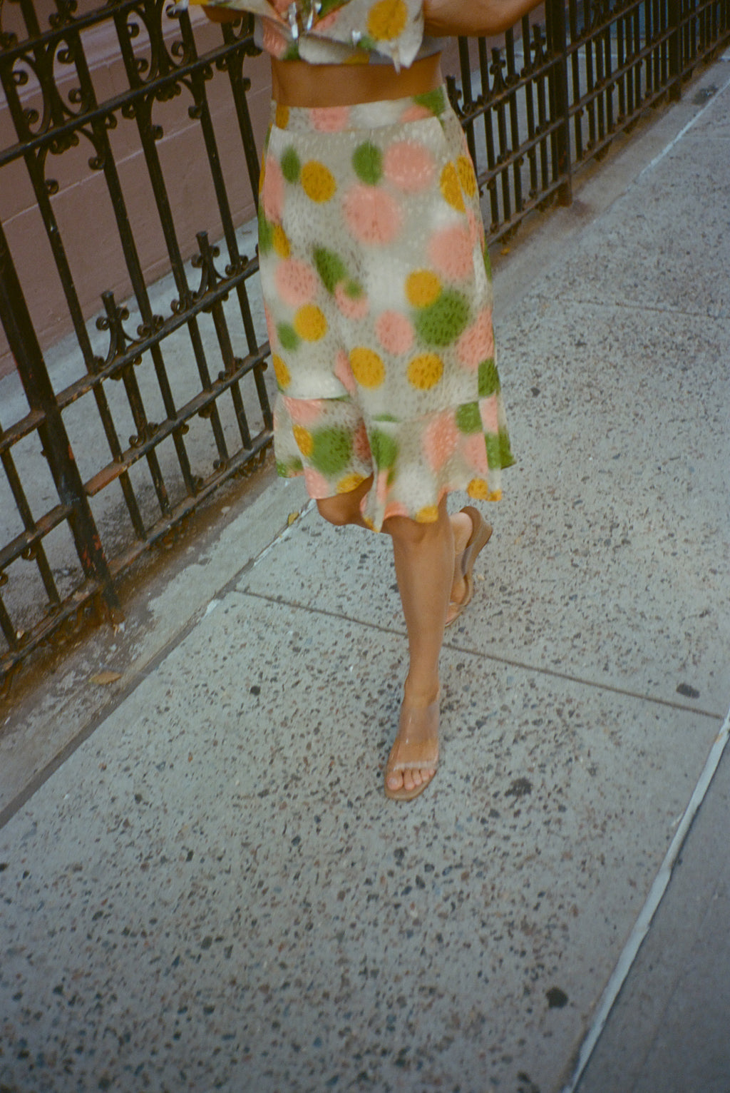Knee length skirt with flounce detail at the bottom, zip closure at back.