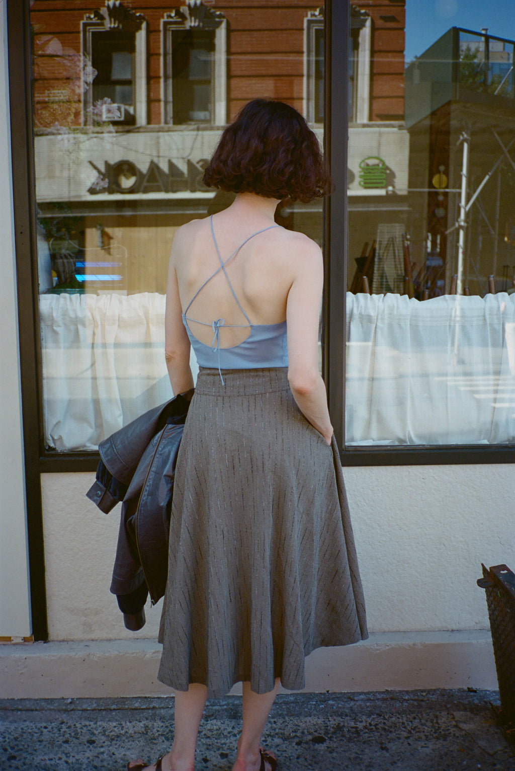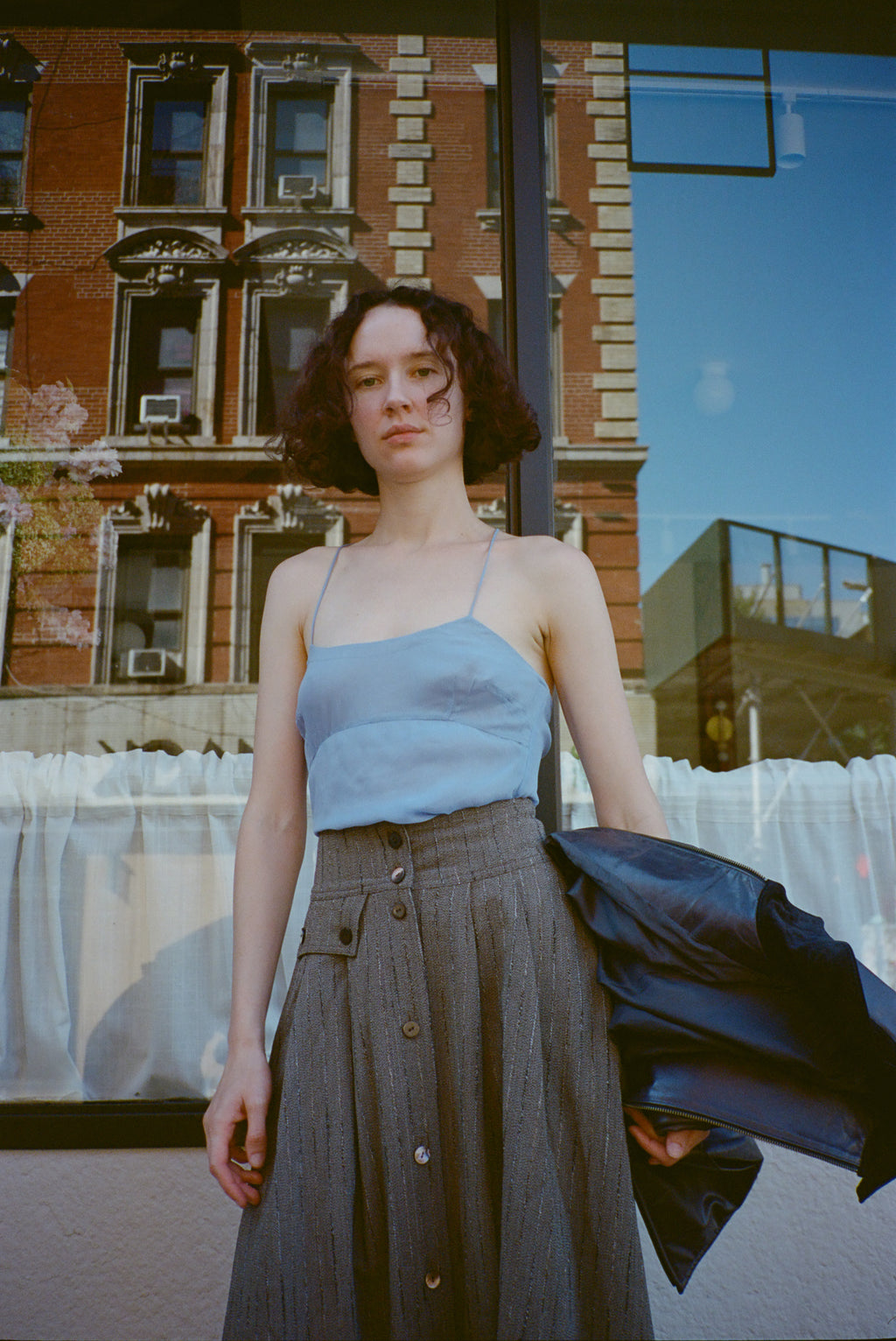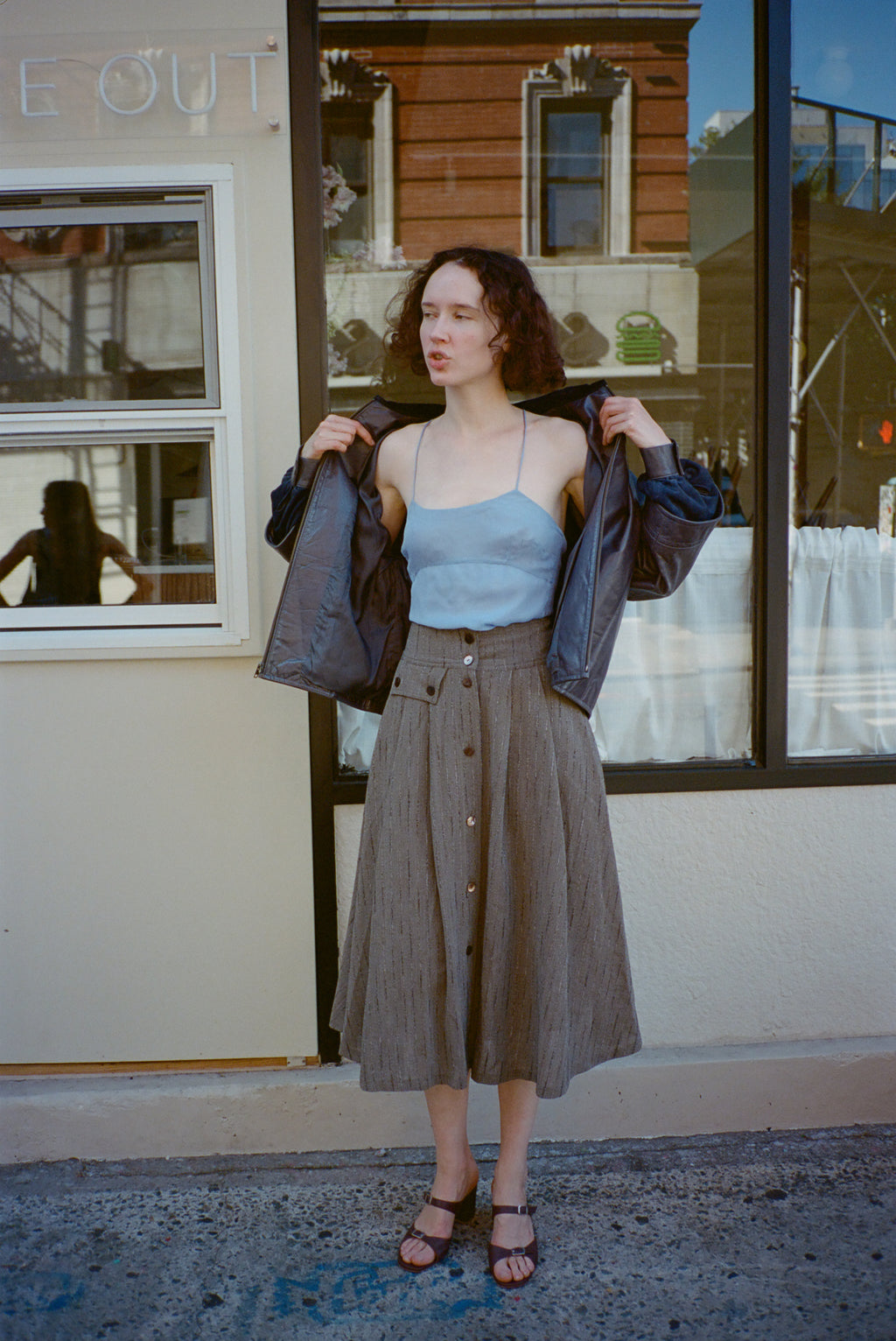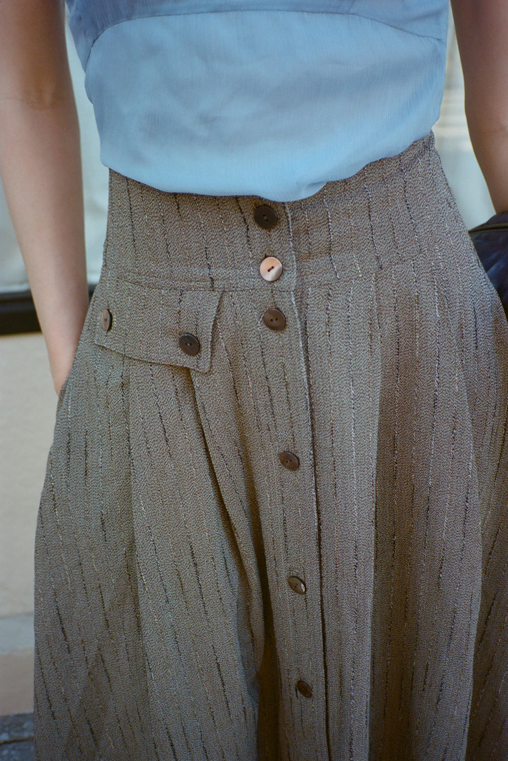 Midi full skirt with flap pocket detail and button closure down the center front.