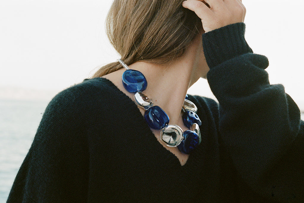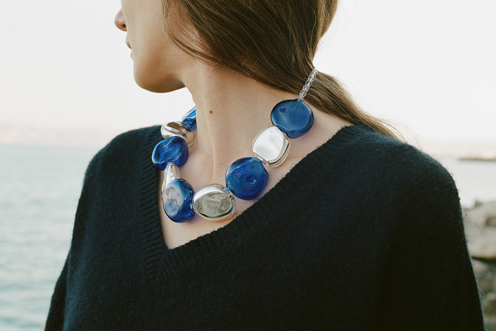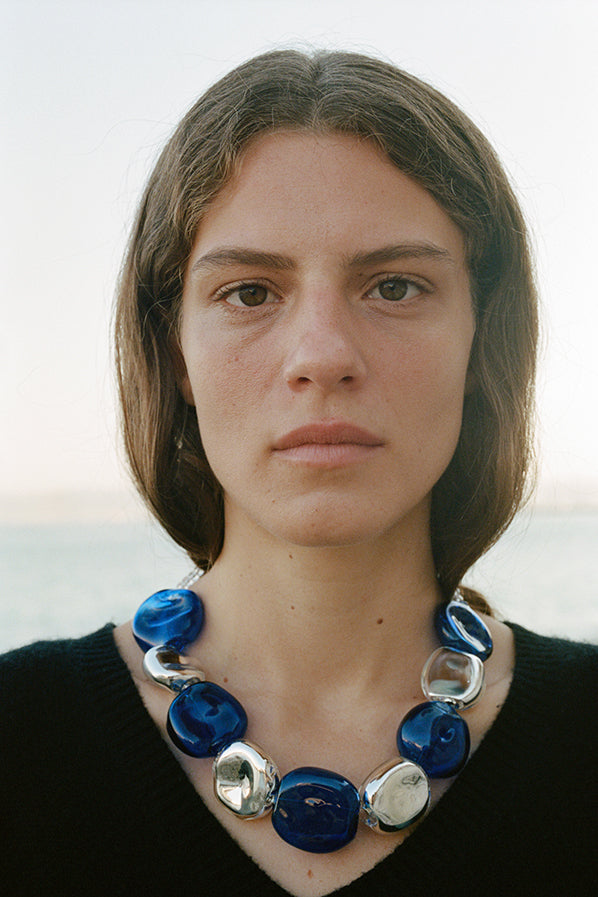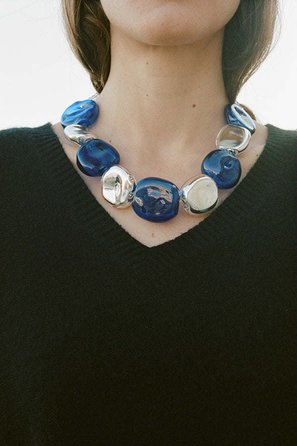 Chunky necklace with handblown glass beads in alternating colors. Clasp closure.