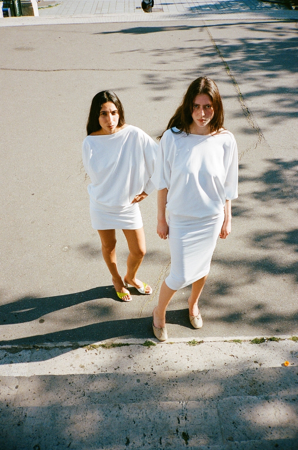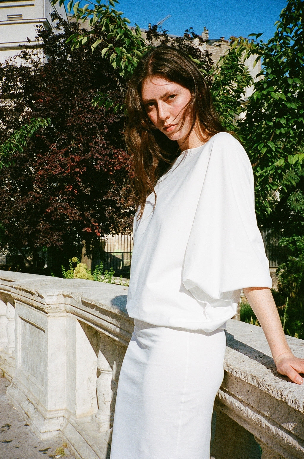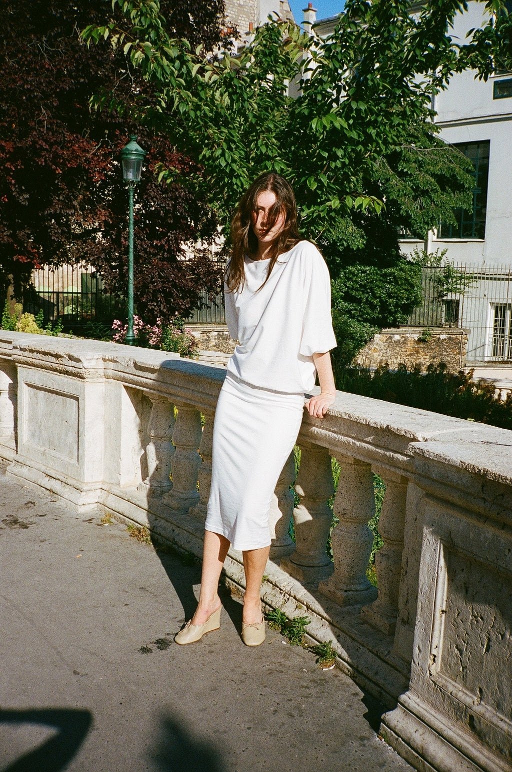 A mid calf length draped dress, fitted at the hips with a wrap belt, long sleeved and straight neck.