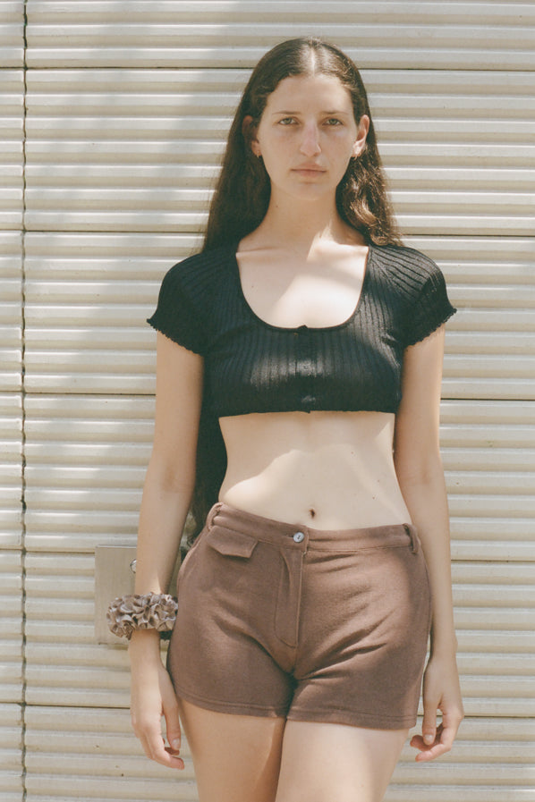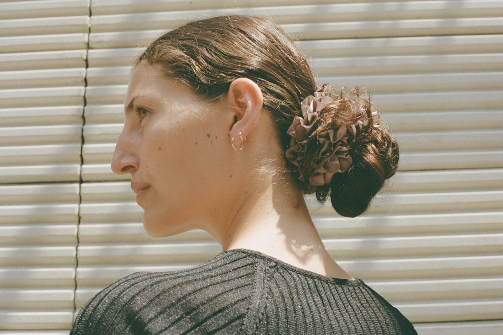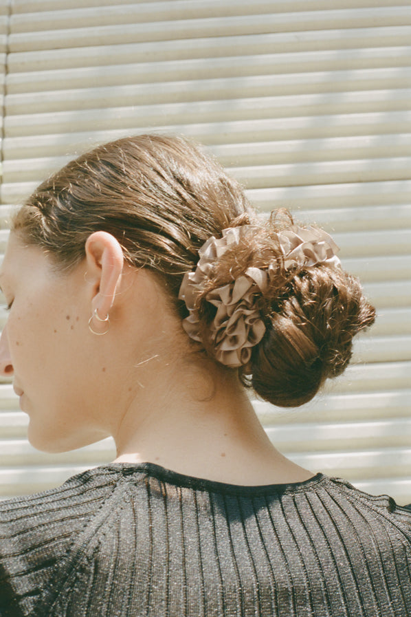 A furled silk scrunchie resembling carnation petals. To be worn in the hair or adorned on the wrist.