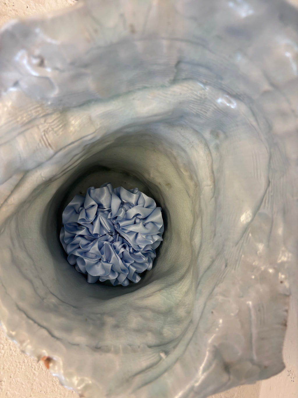 A furled silk scrunchie resembling carnation petals. To be worn in the hair or adorned on the wrist.