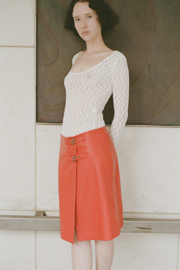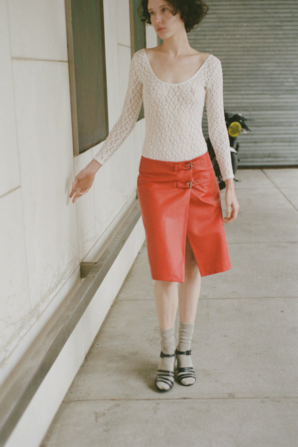 Low waist wrap skirt with two buckle closure at the hip.