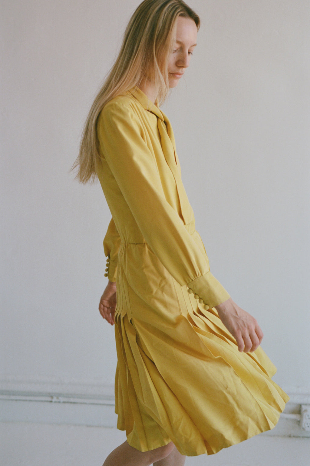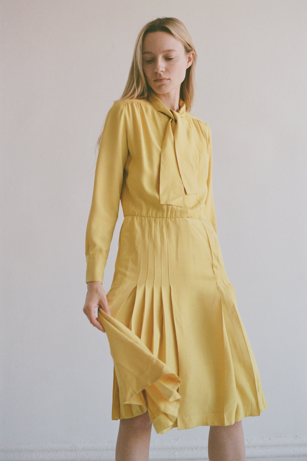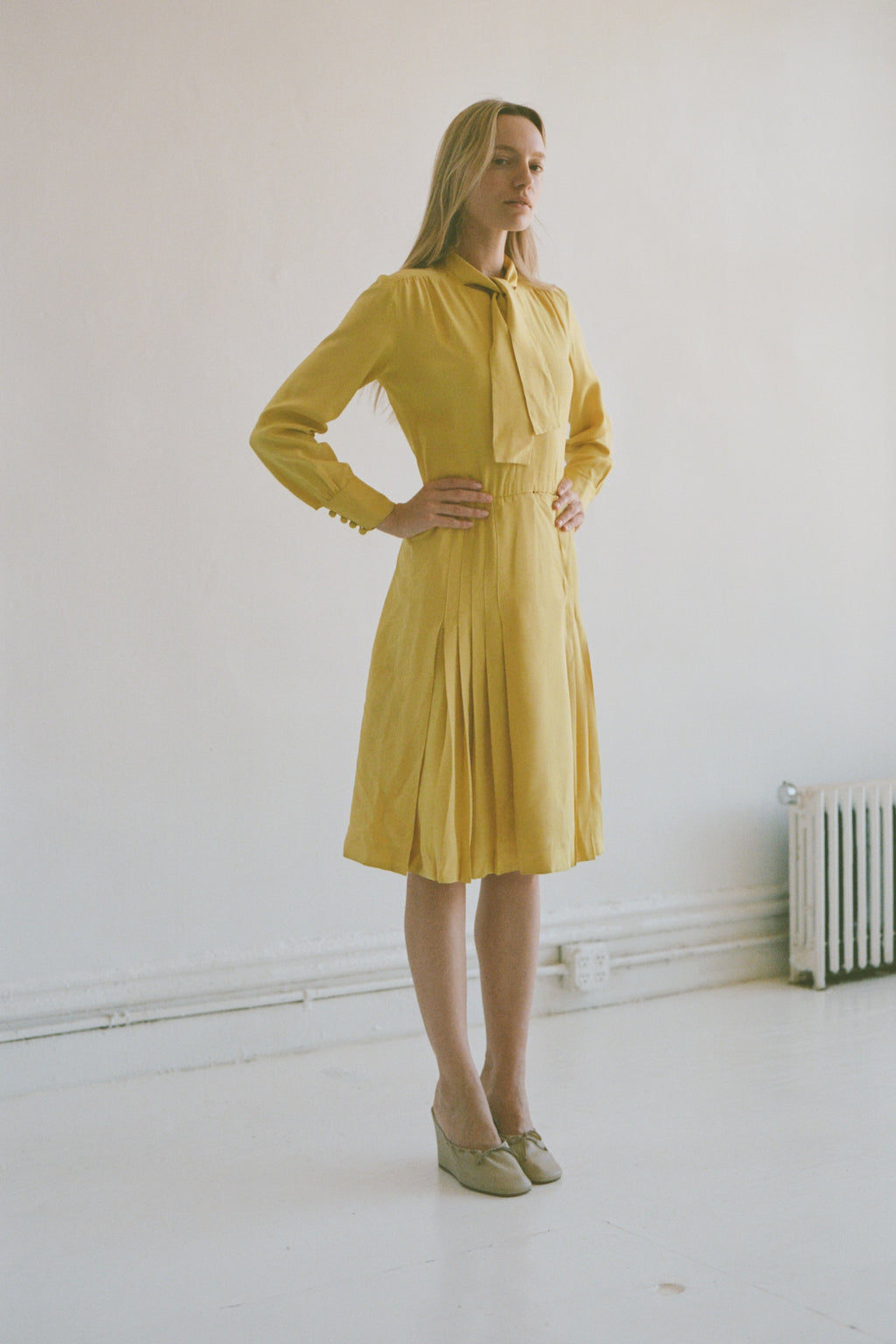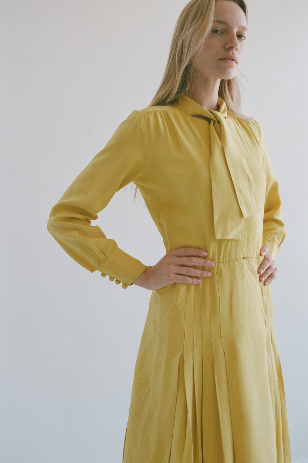Vintage dress with long sleeves and bow at collar. Pleating from waist down. Handmade.