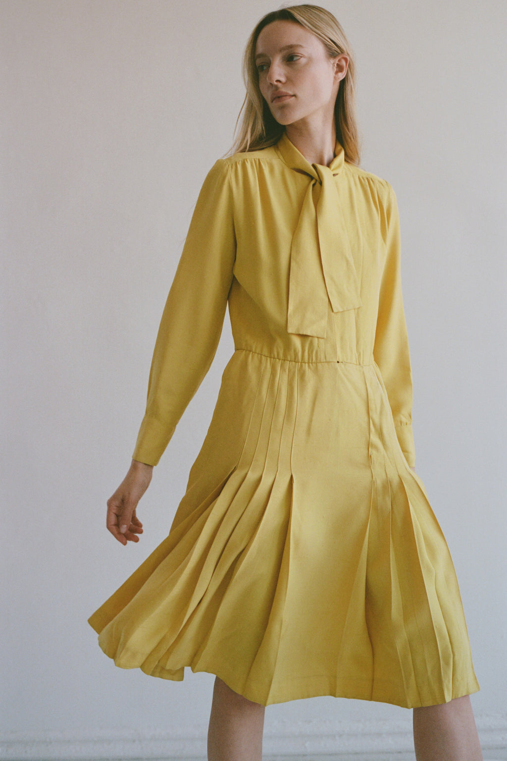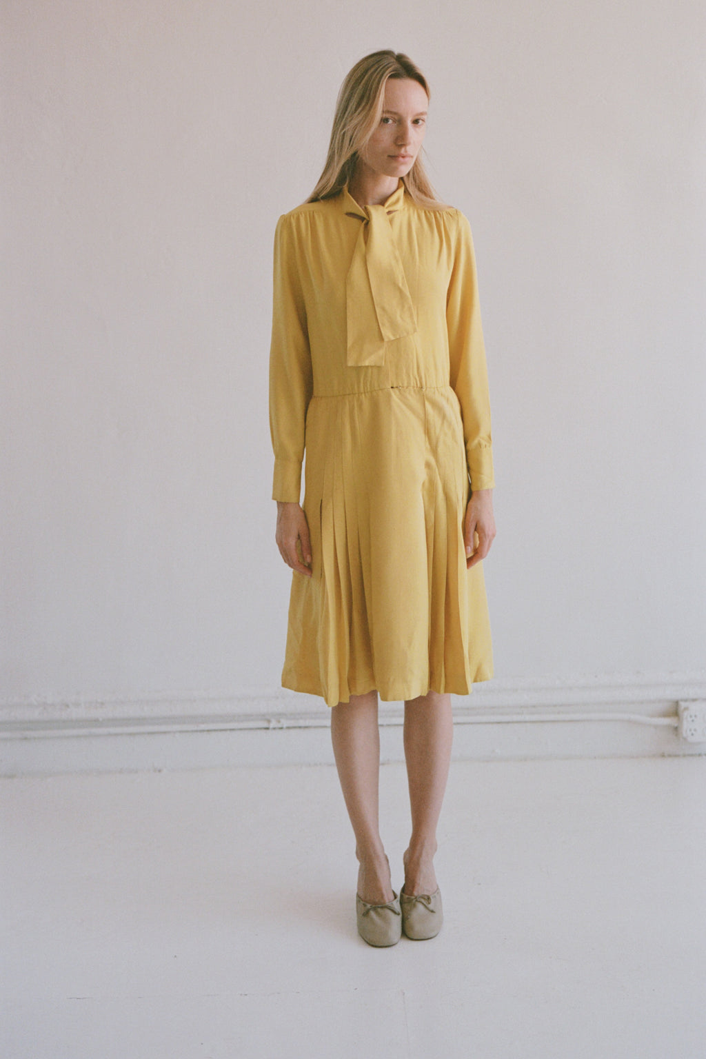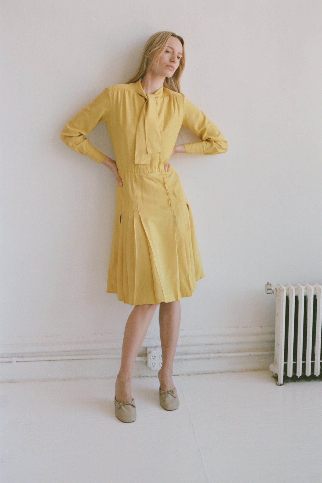 Vintage dress with long sleeves and bow at collar. Pleating from waist down. Handmade.
