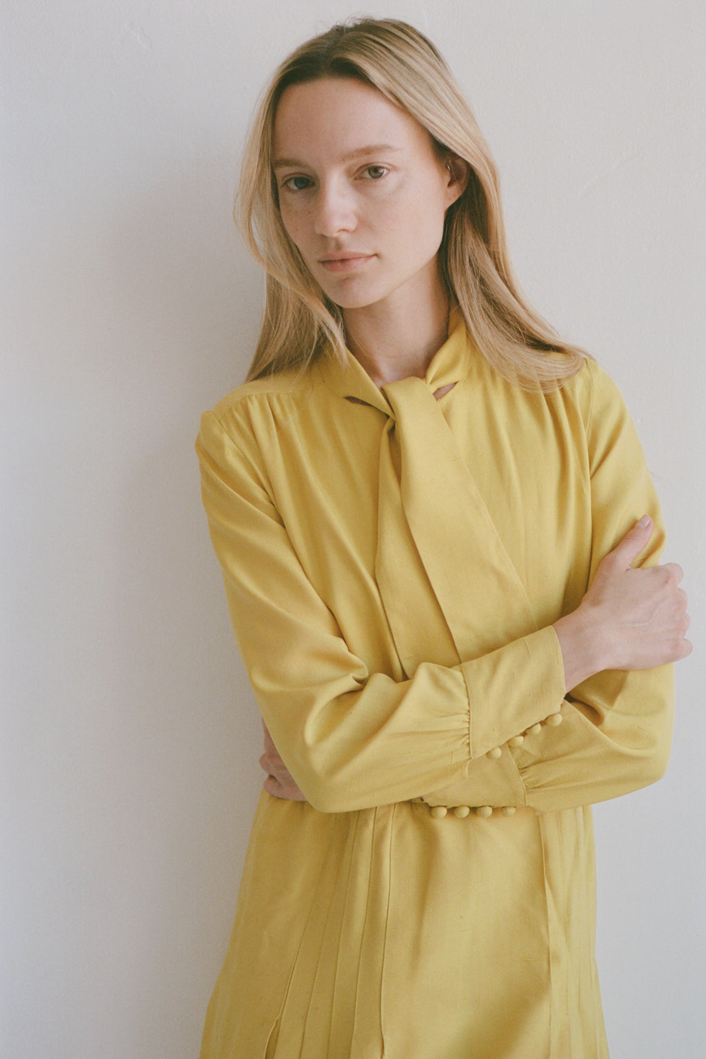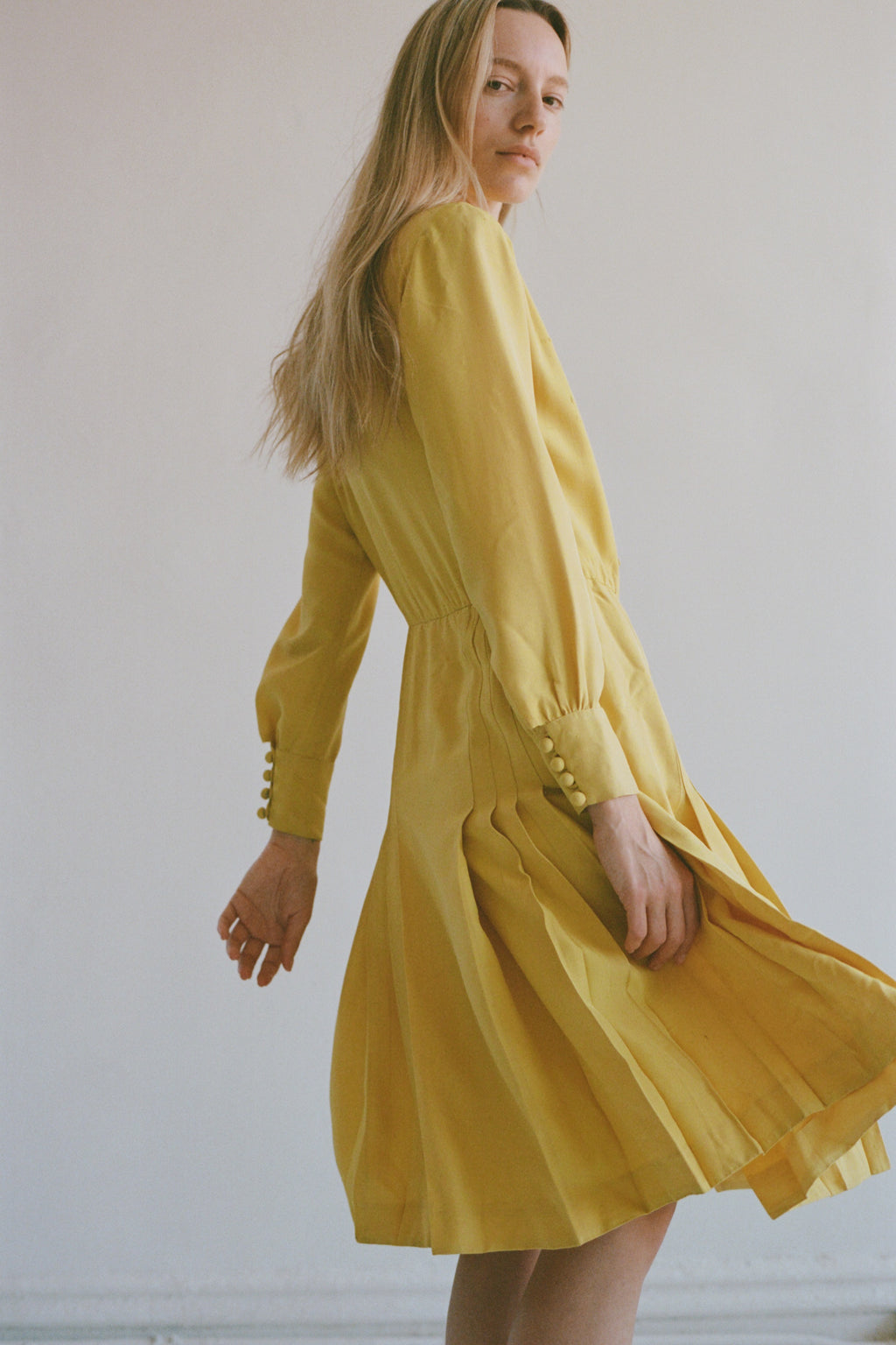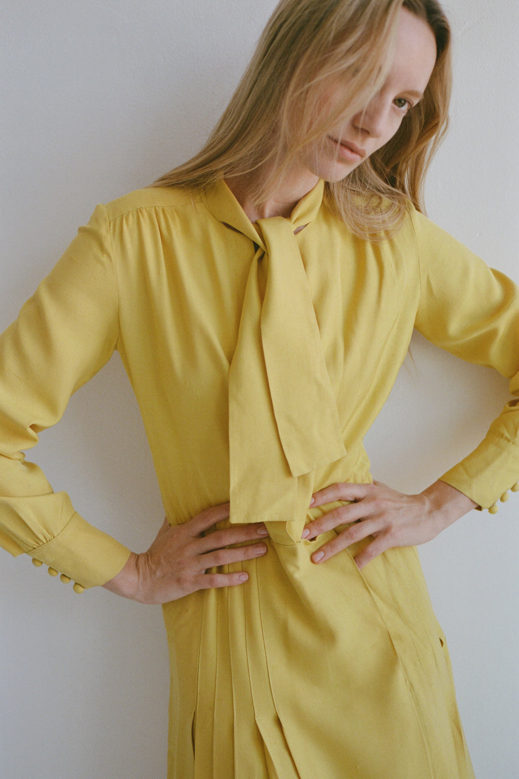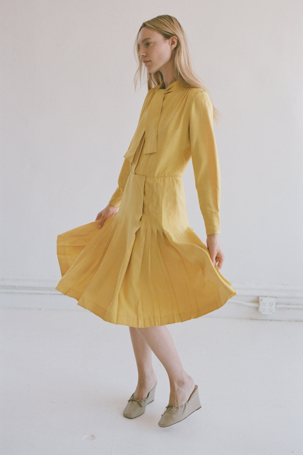 Vintage dress with long sleeves and bow at collar. Pleating from waist down. Handmade.