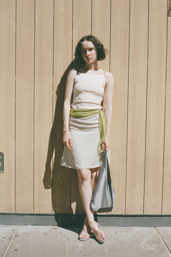 A shoulder tote bag with ovular construction and a wide flat strap.
