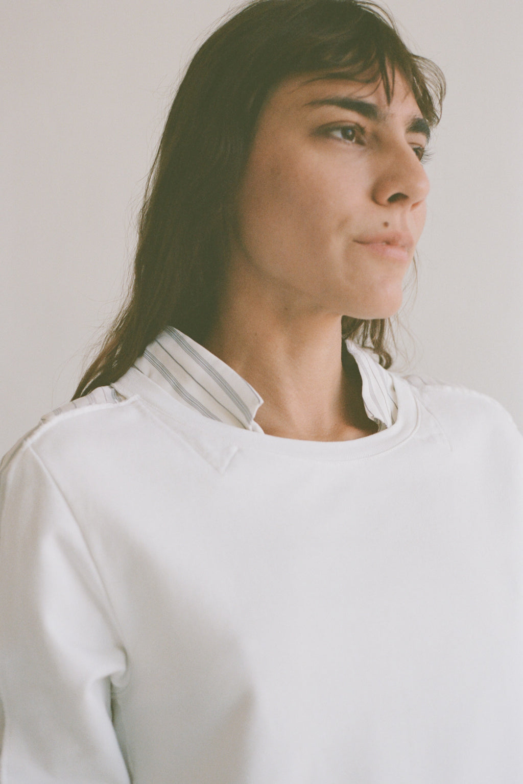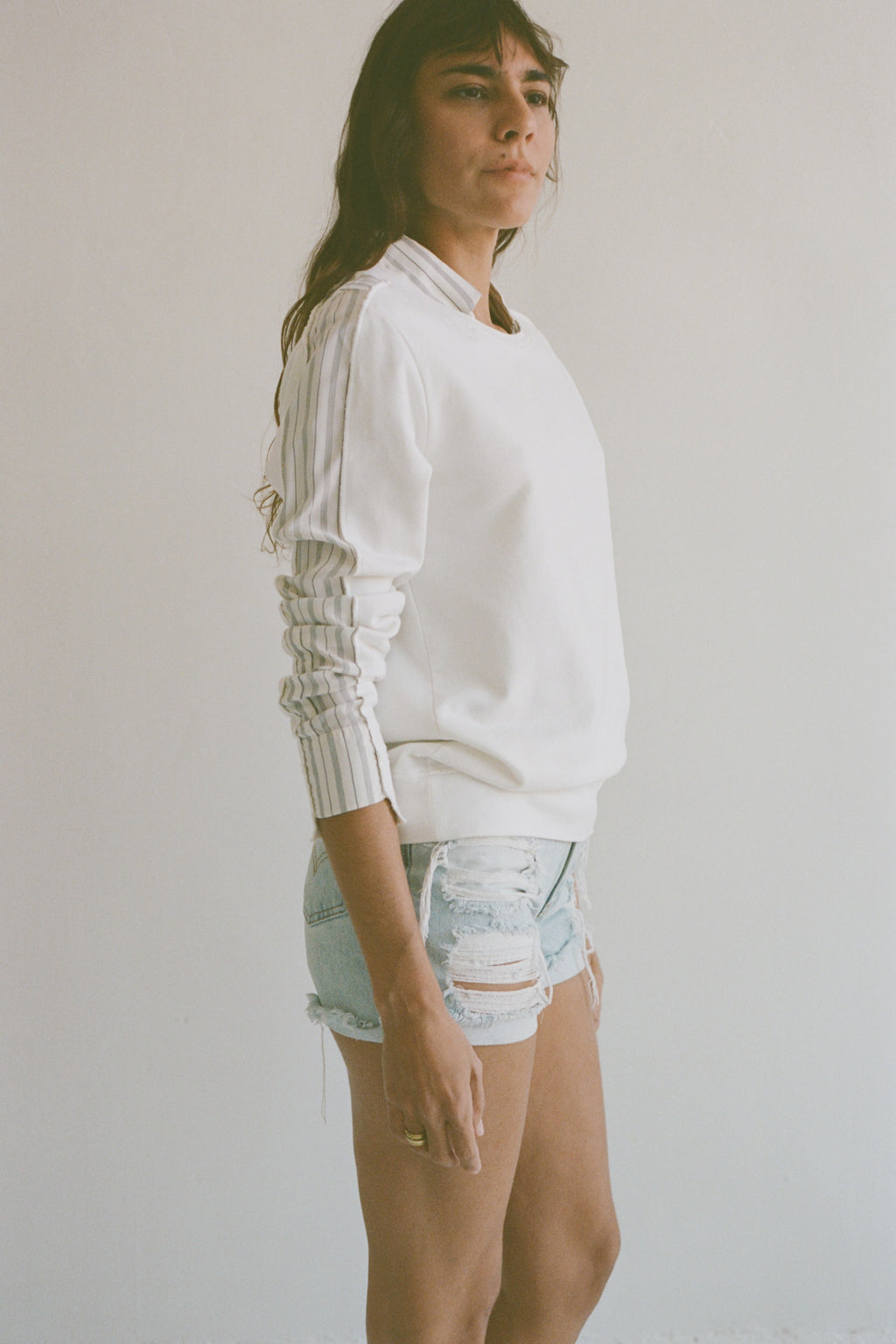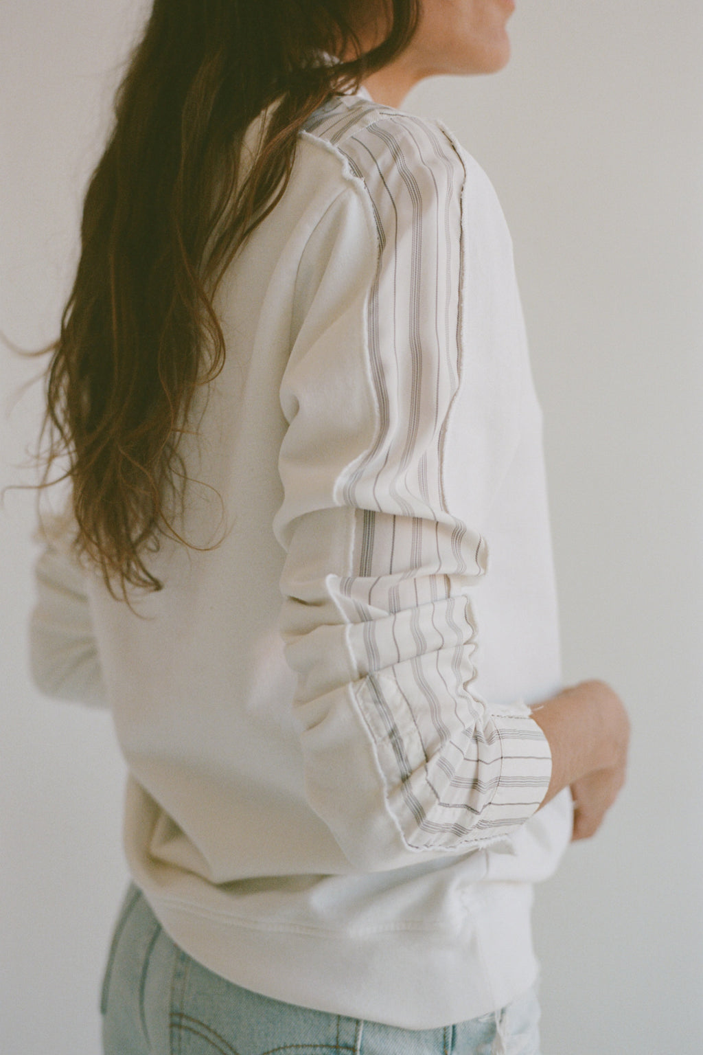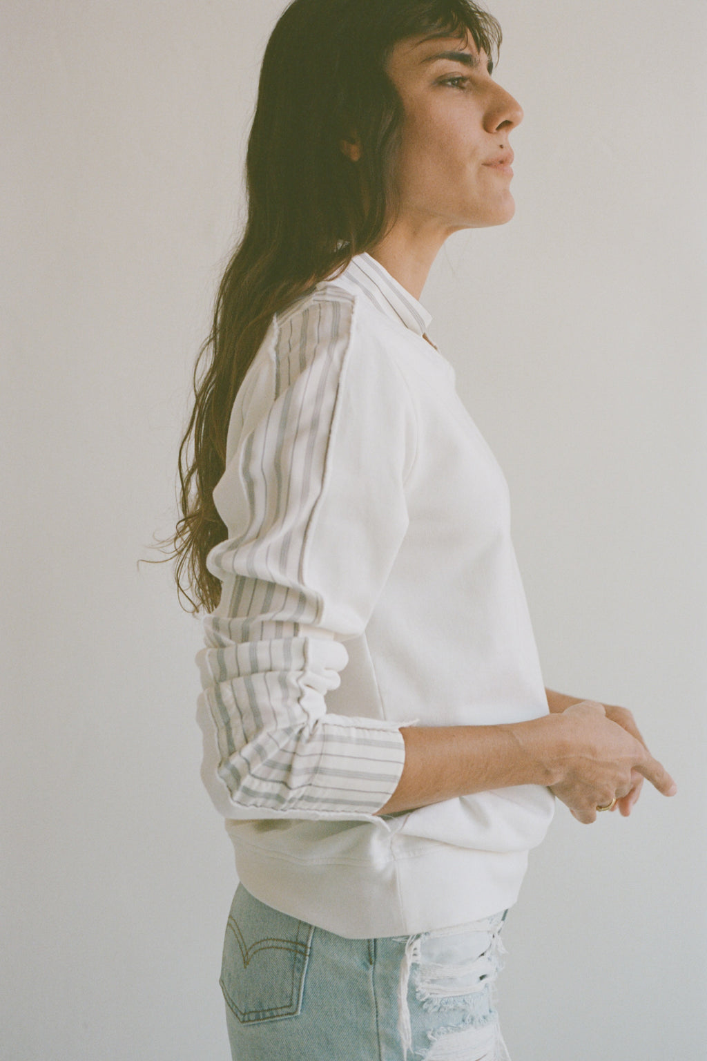 Classic Margiela reworked white lightweight sweatshirt with striped shirt sewn in.