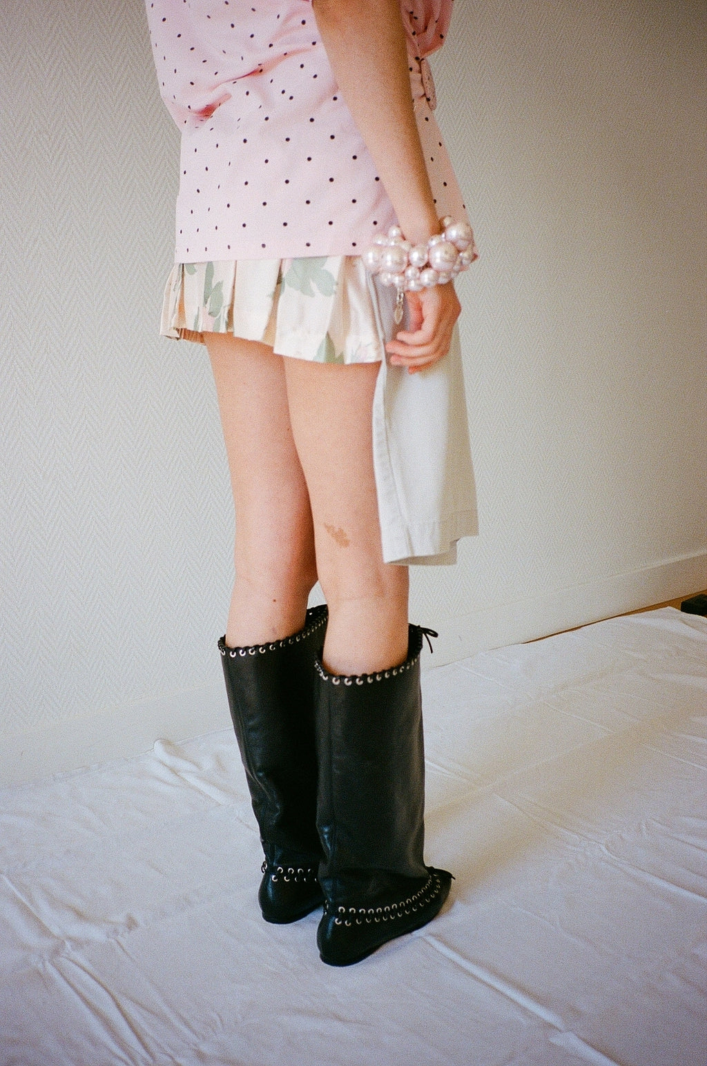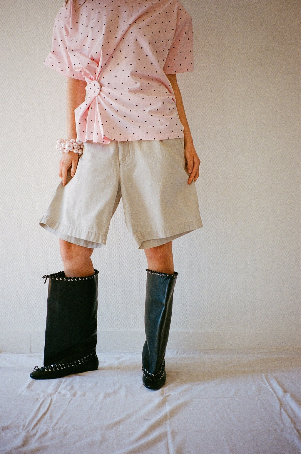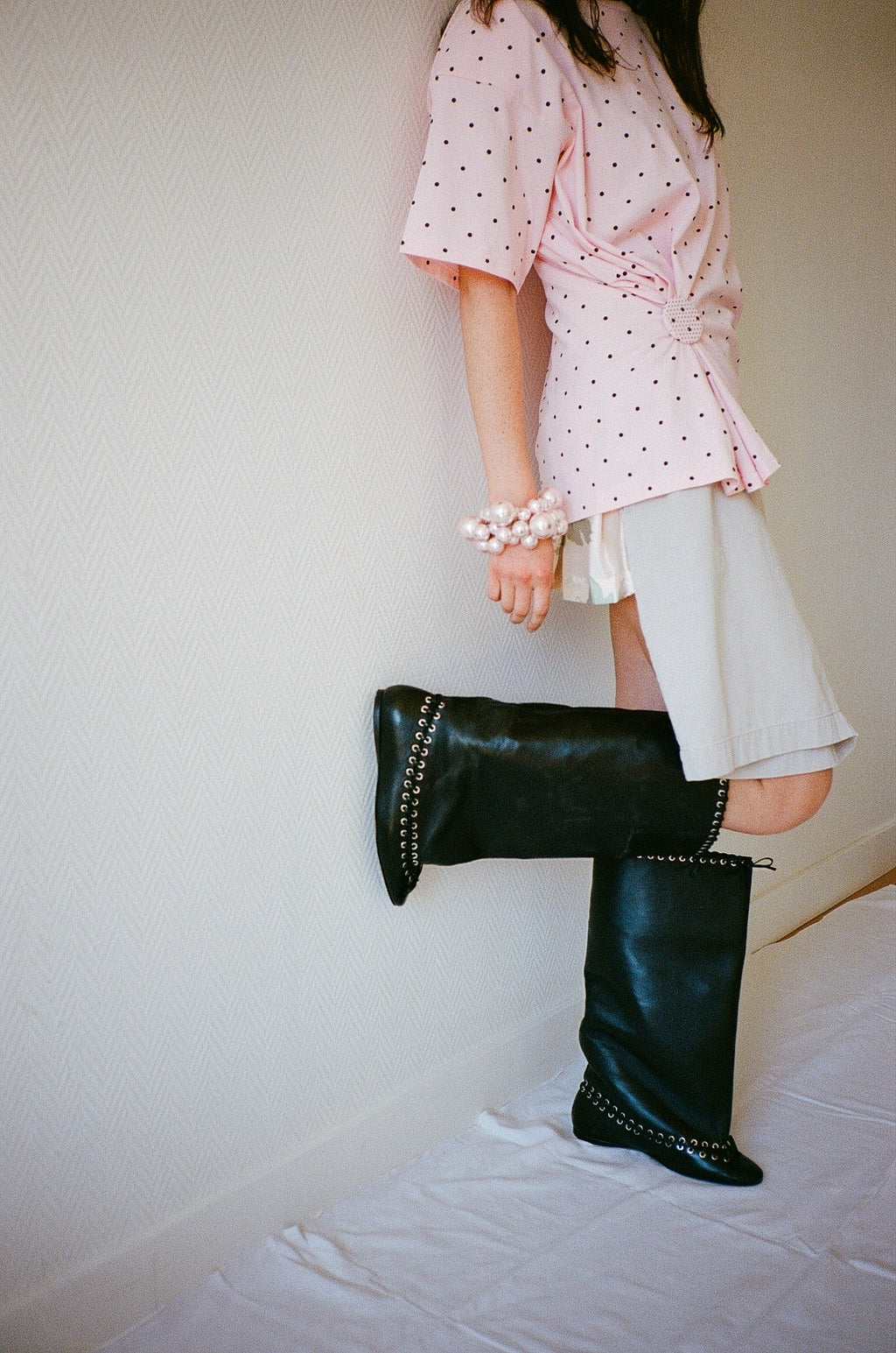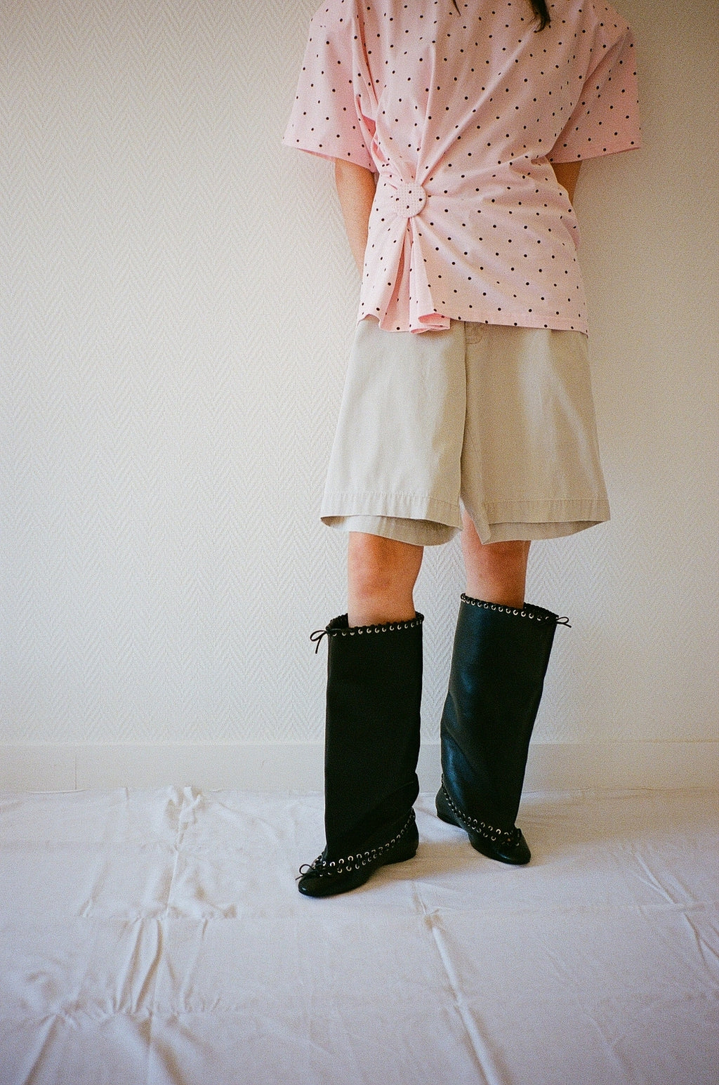 Knee high Level Boot, flat in black nappa leather with silver metal grommets and leather lacing. The boot has a rounded ballerina toe with a contrasting slouchy leather sleeve.  Fits true to size. If in between sizes, we recommend sizing up.
