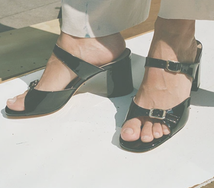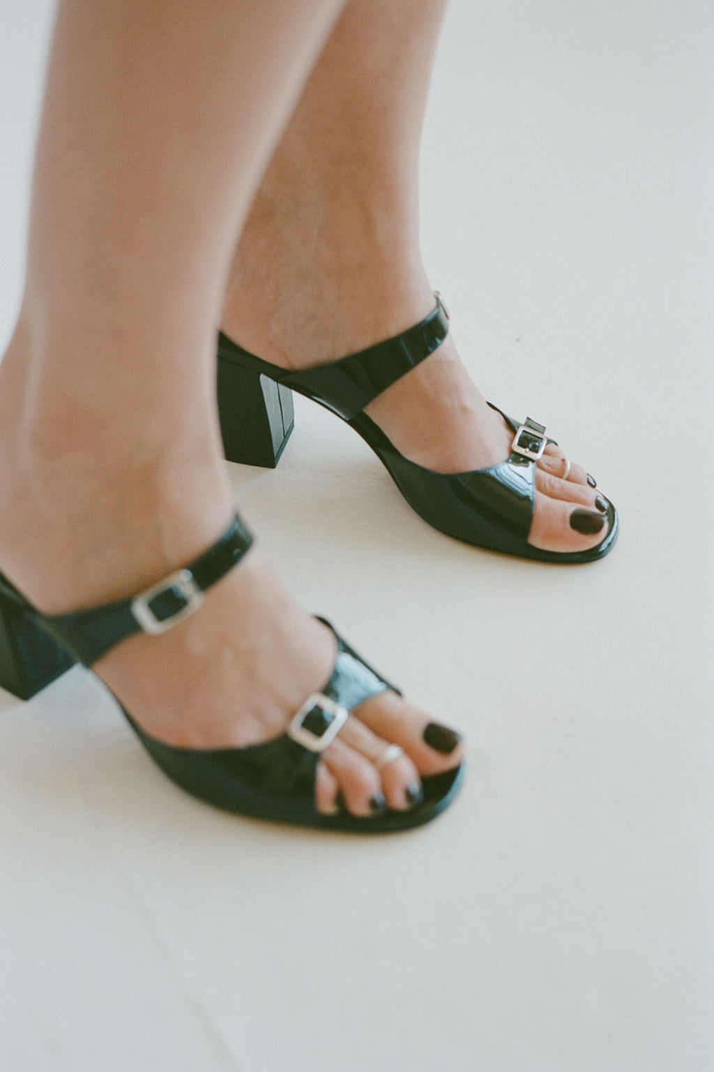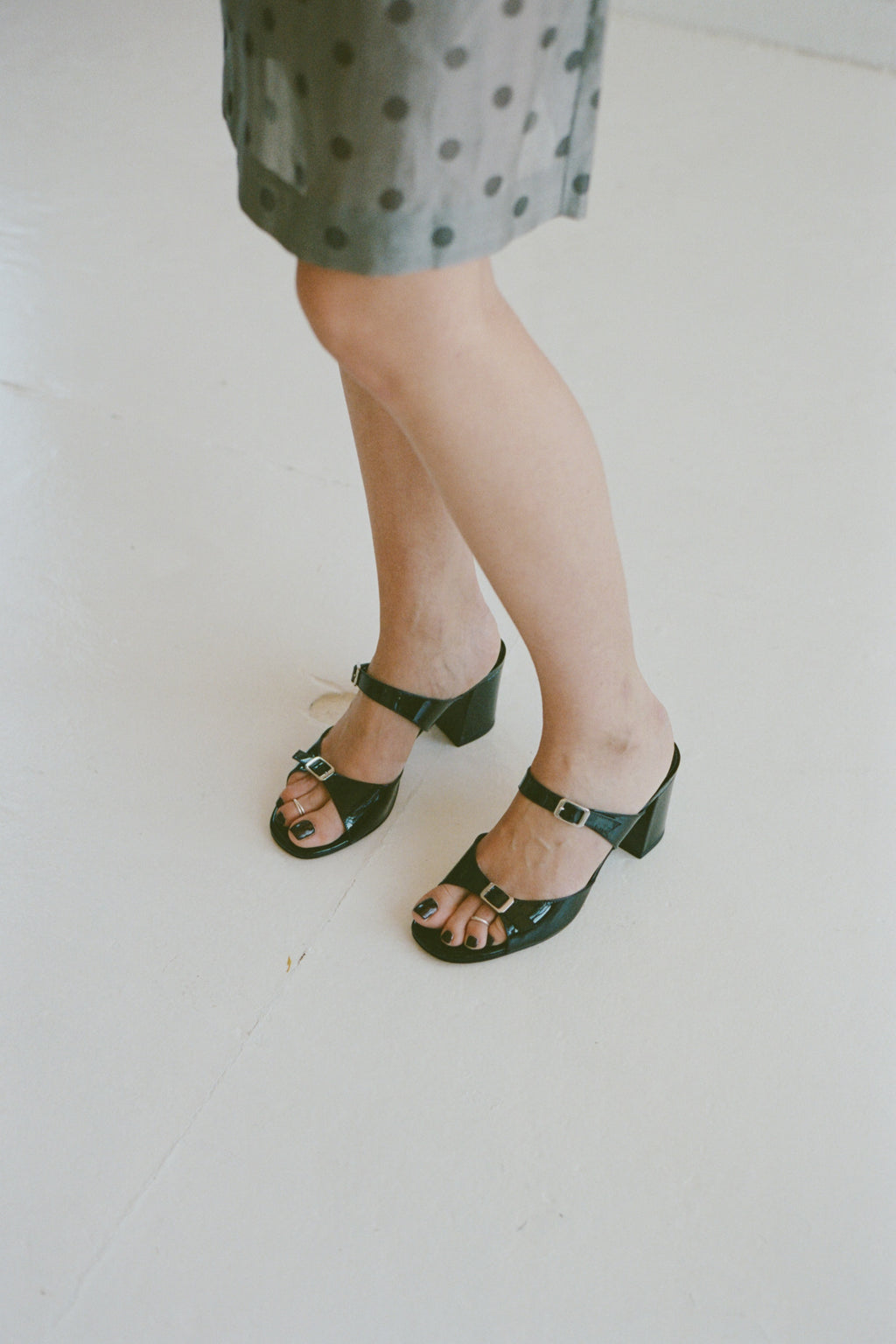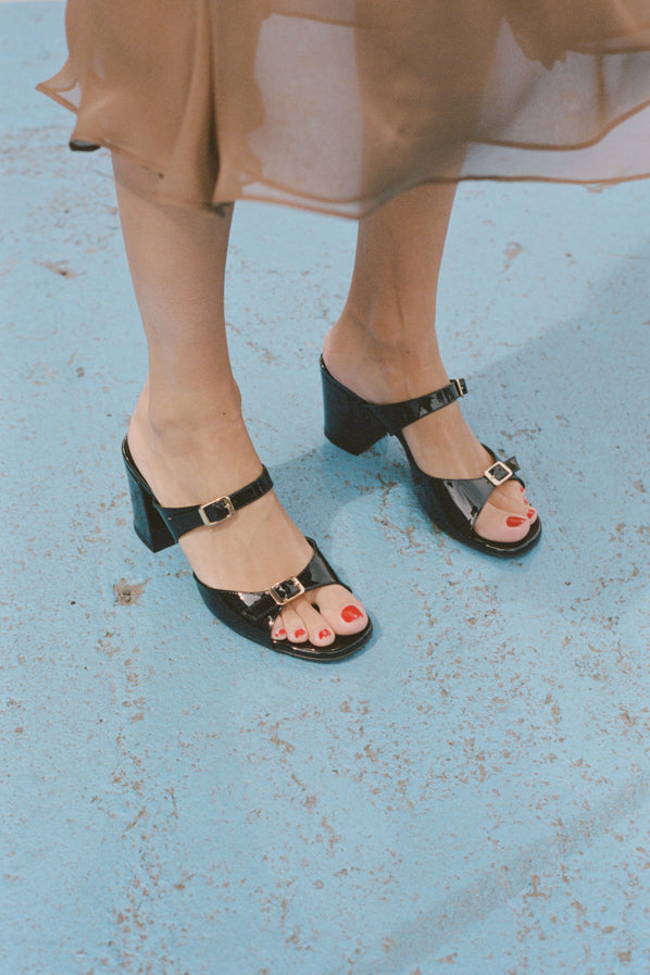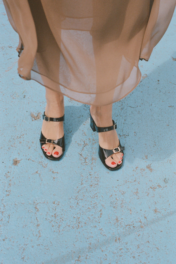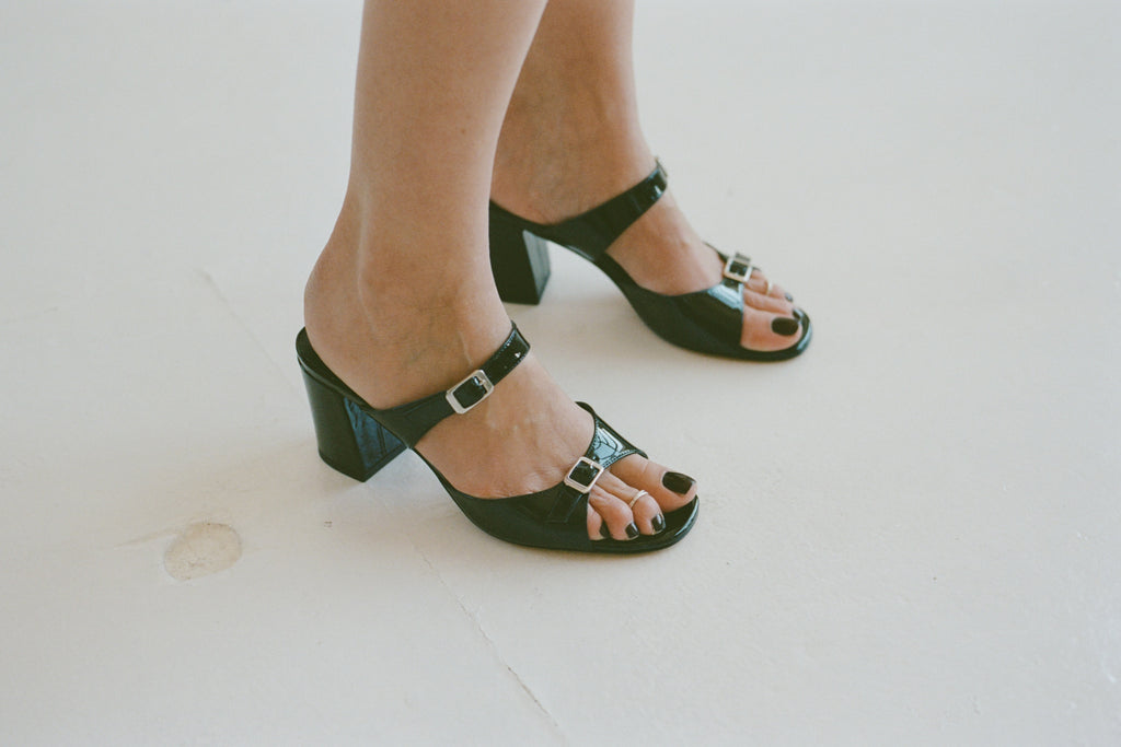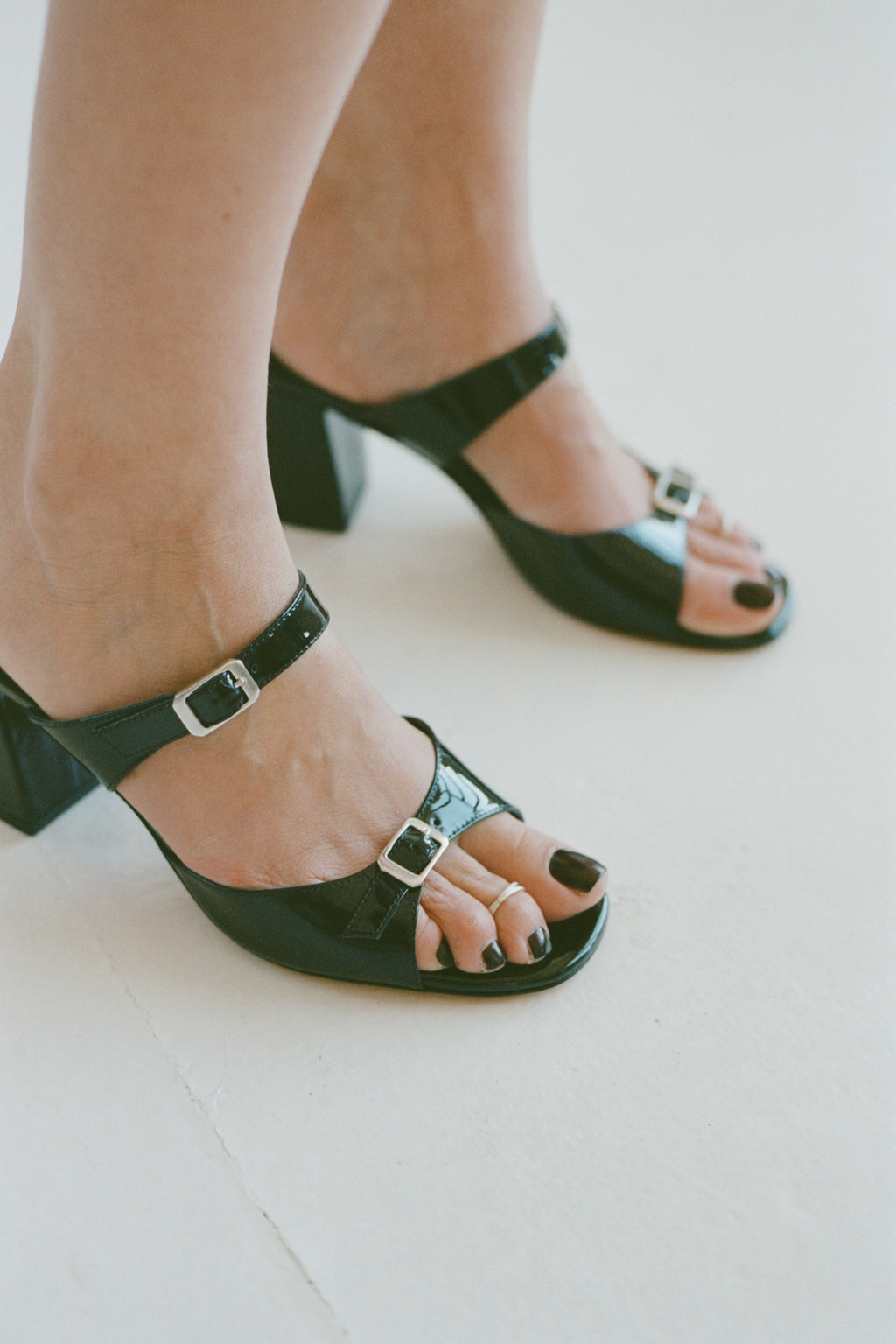 A vintage-style high heel with two straps and buckle fastenings. Gold-toned hardware. 8cm block heel. Runs small. We suggest sizing a half size up.