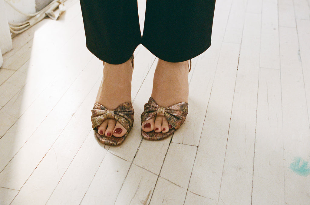 A heeled sandal with a bow detail on the lower strap.