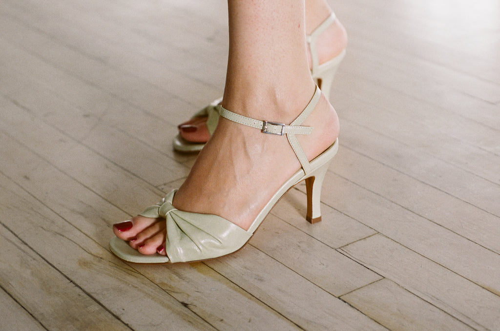A heeled sandal with a bow detail on the lower strap.